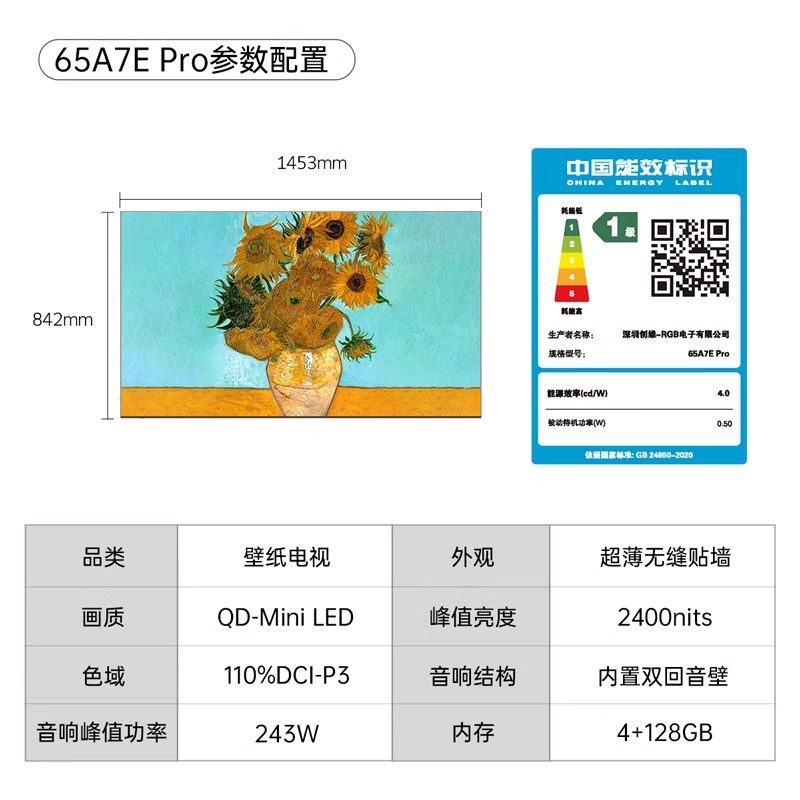 创维壁纸电视A7E Pro 65寸Mini LED 4+128GB超薄壁画艺术电视机