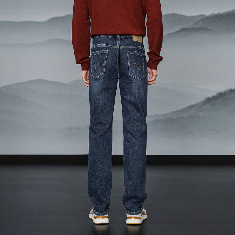 吉普专柜秋冬季新款复古牛仔裤男宽松直筒大码加绒加厚水洗长裤子