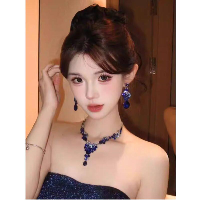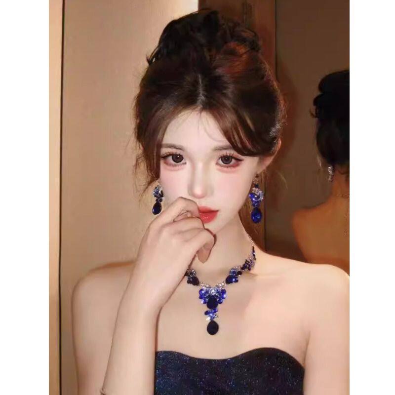 复古蓝色皓石项链耳环套装女轻奢夸张颈链名媛千金晚礼服新娘配饰
