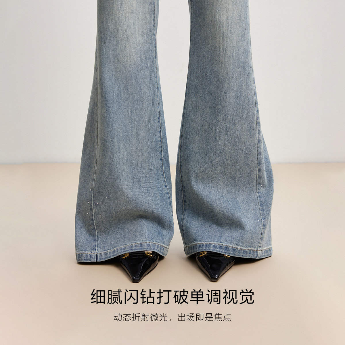 喇叭牛仔长裤,重工闪耀贴钻,