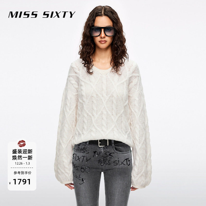 Miss Sixty2025冬季新款马海毛针织衫女V领绞花菱格亮丝毛衣上衣