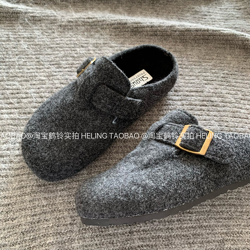 乌木灰~INS高级感灰色勃肯鞋女雪地靴冬季韩版赫本风毛呢半拖棉鞋