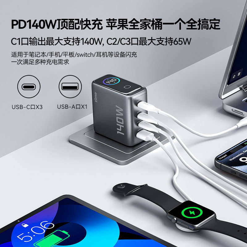 紫米正品140W智能数显充电器多口PD快充头适用华为小米苹果iPhone17/16手机Macbook笔记本电脑iPad充电头100W