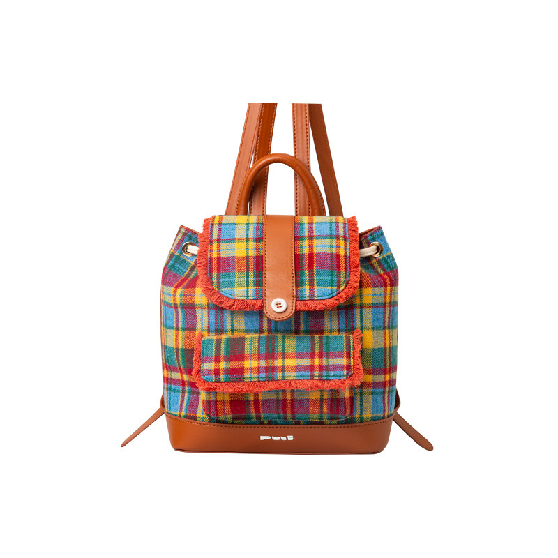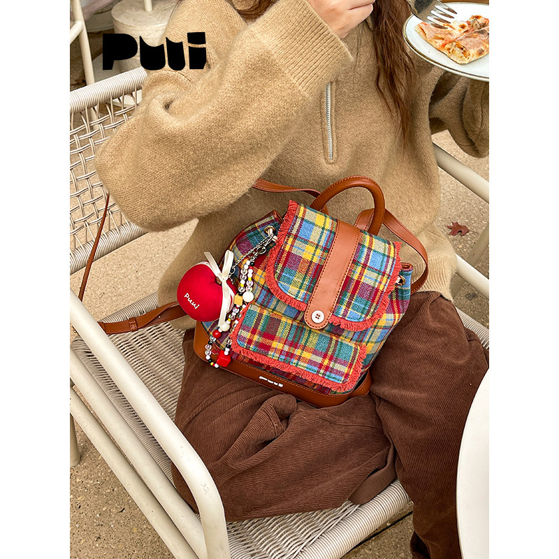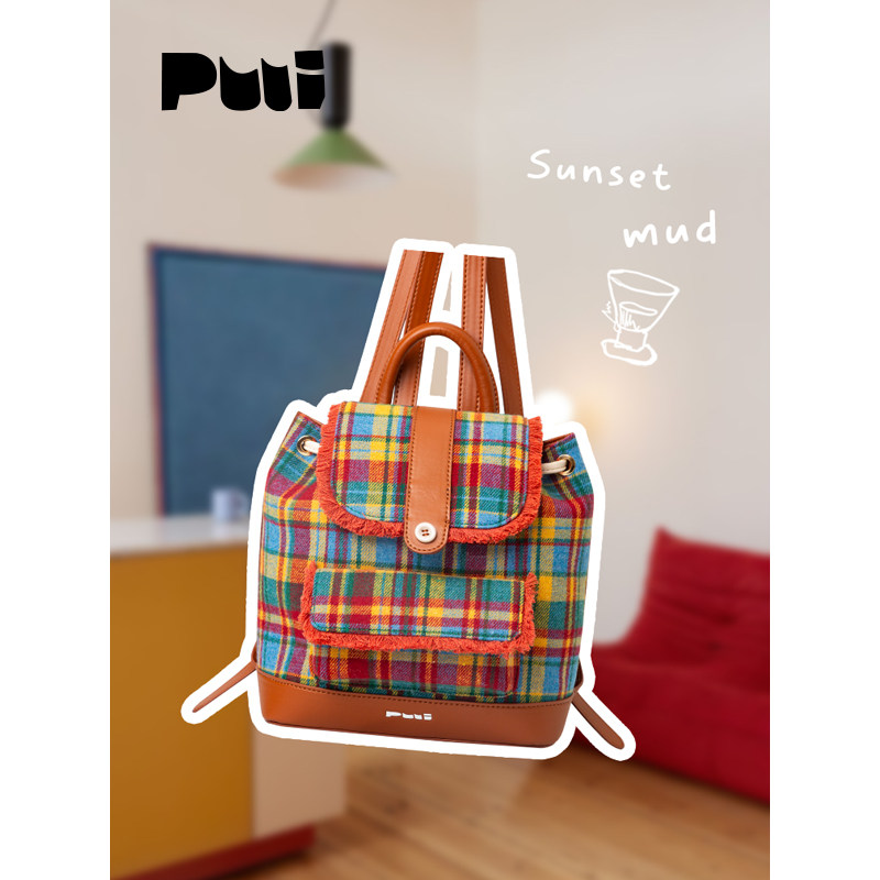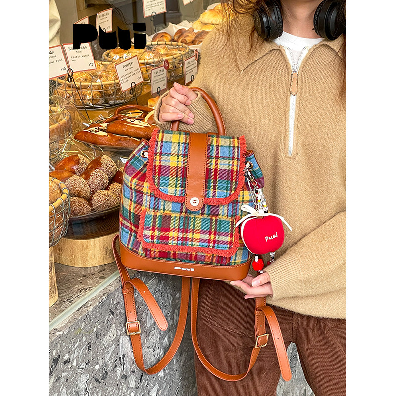 puui原创生活双肩包秋冬复古格纹抽绳束口包质感ins翻盖小背包