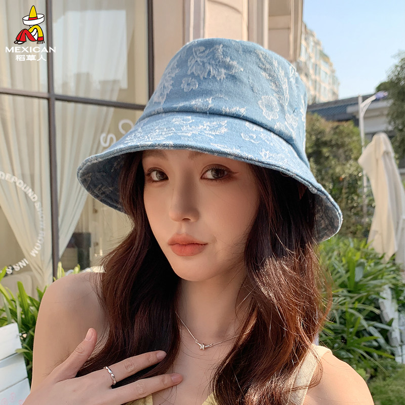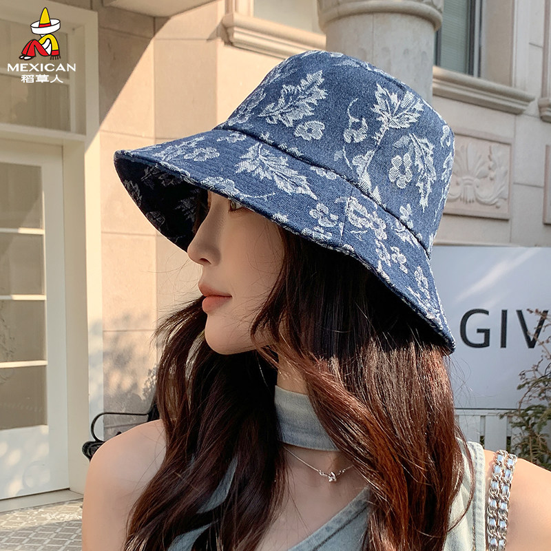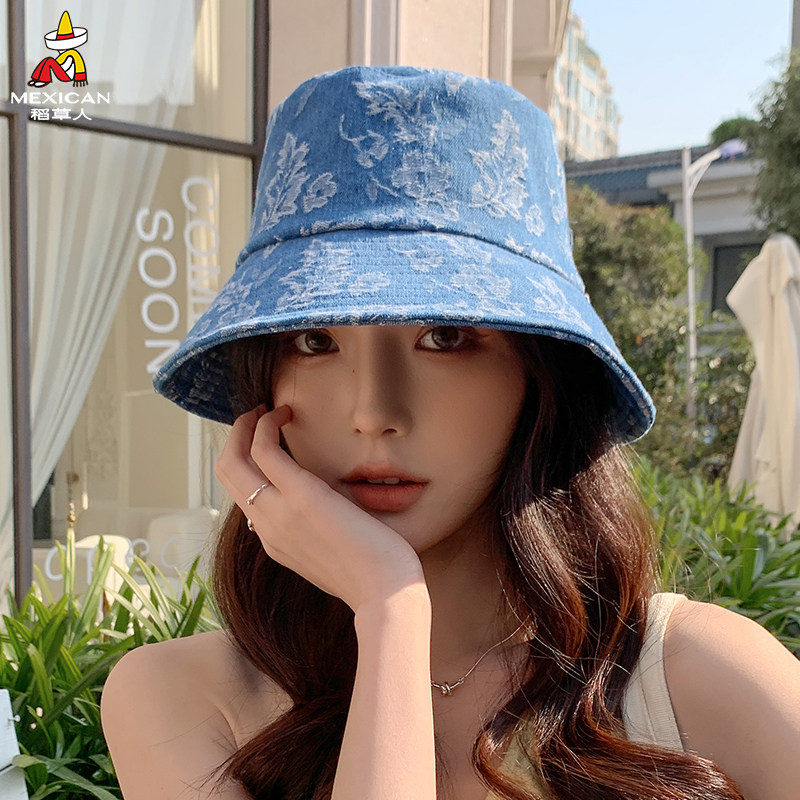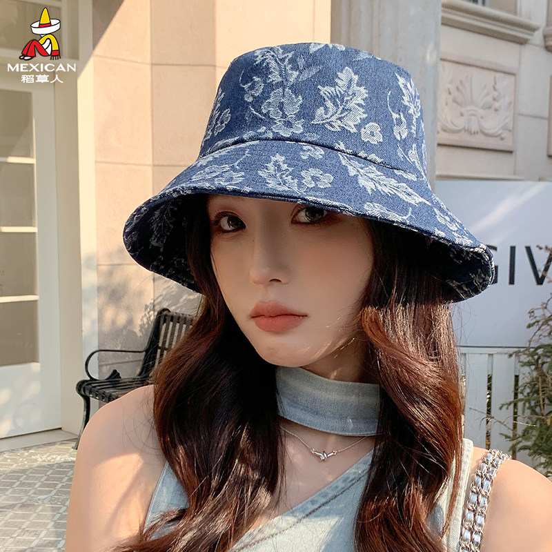 稻草人时尚牛仔印花水洗渔夫帽女休闲夏季宽檐遮阳防晒百搭盆帽