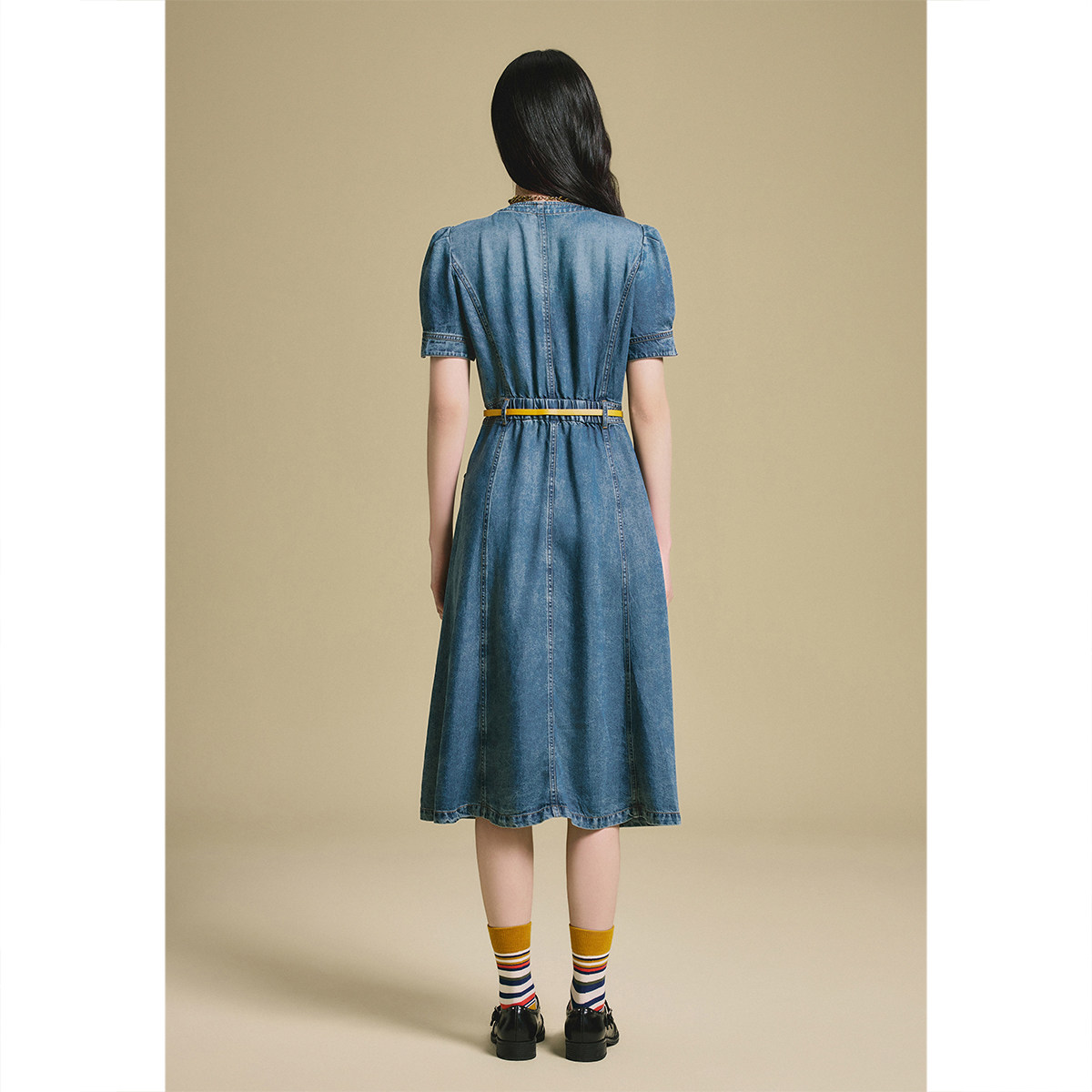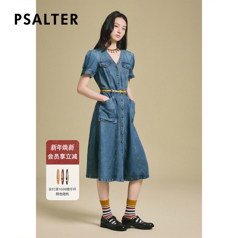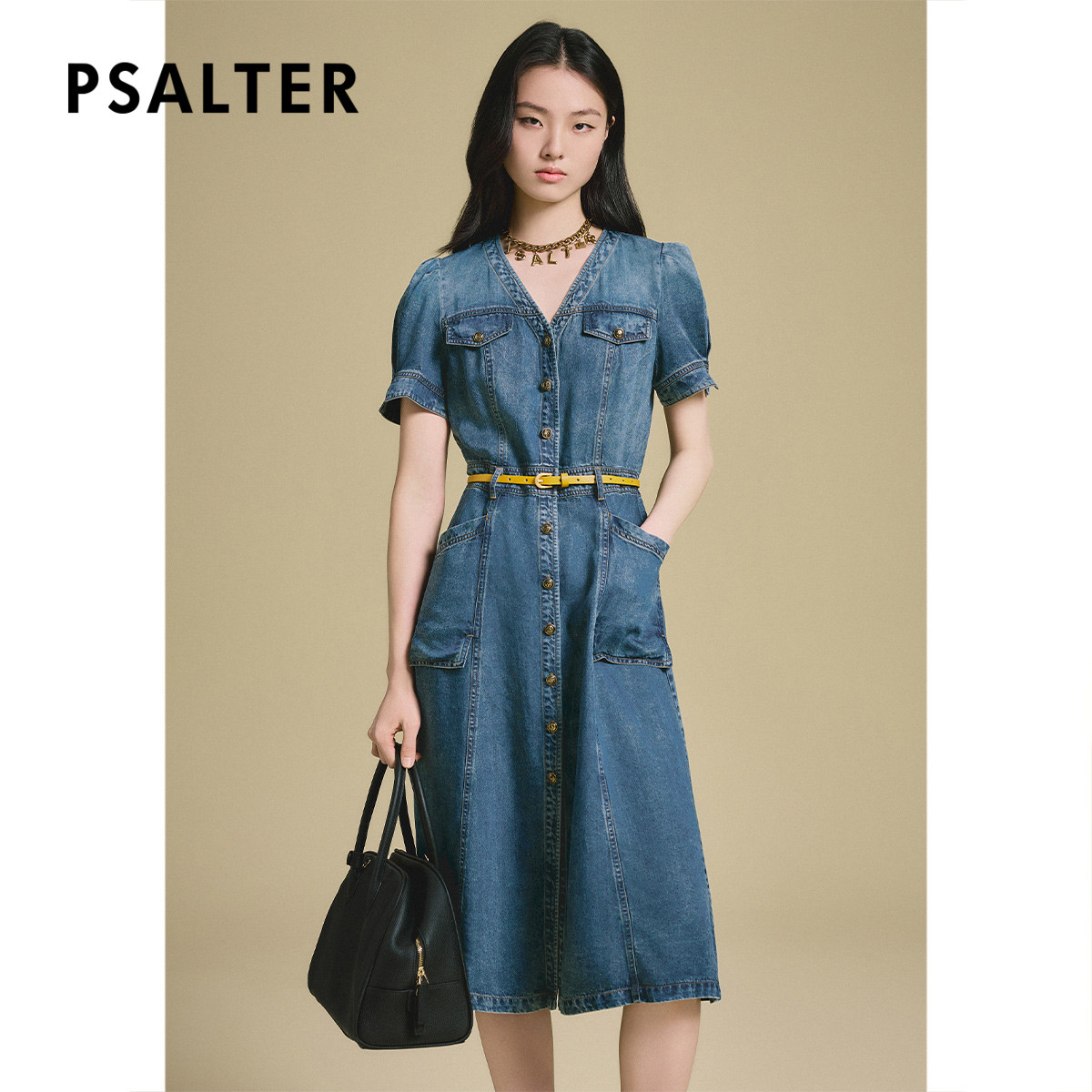 诗篇专选气质V领泡泡袖莱赛尔对称口袋牛仔连衣裙2025夏季新款