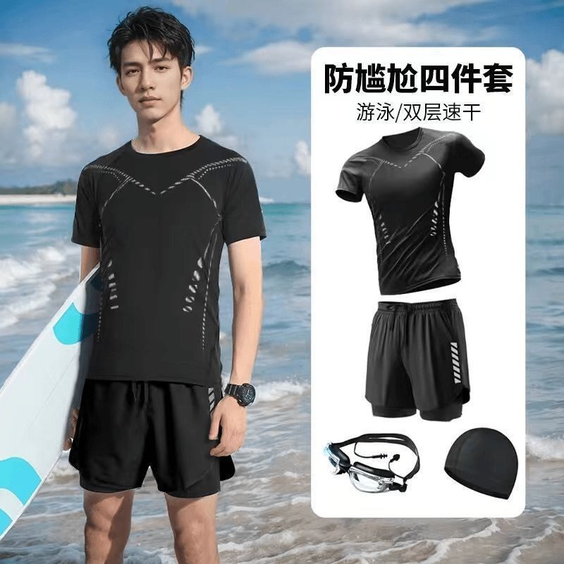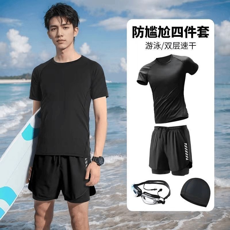 男士泳衣套装新款速干双层泳裤长袖防晒沙滩上衣成人全套游泳装备