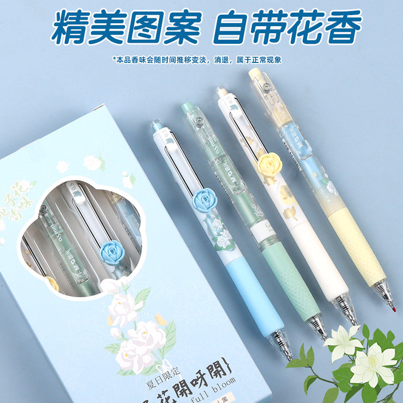 晨光夏日限定栀子花开按动中性笔刷题笔带栀子花香味高颜值0.5mm速干学生考试笔大容量顺滑黑色水性笔签字笔
