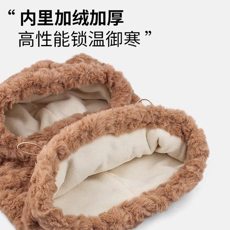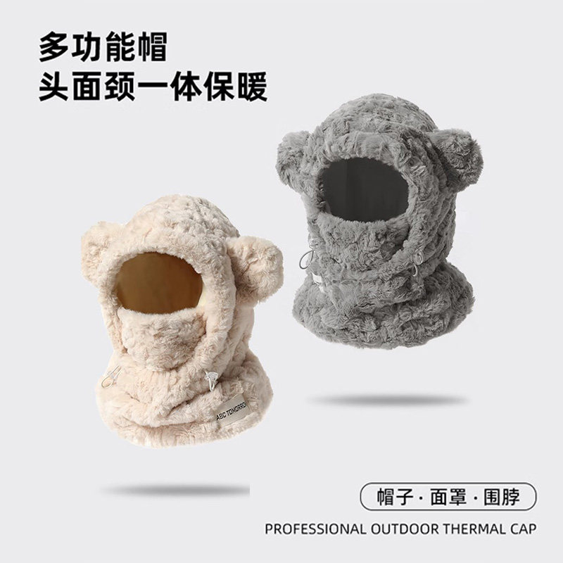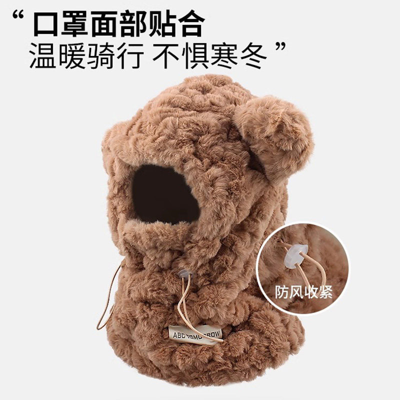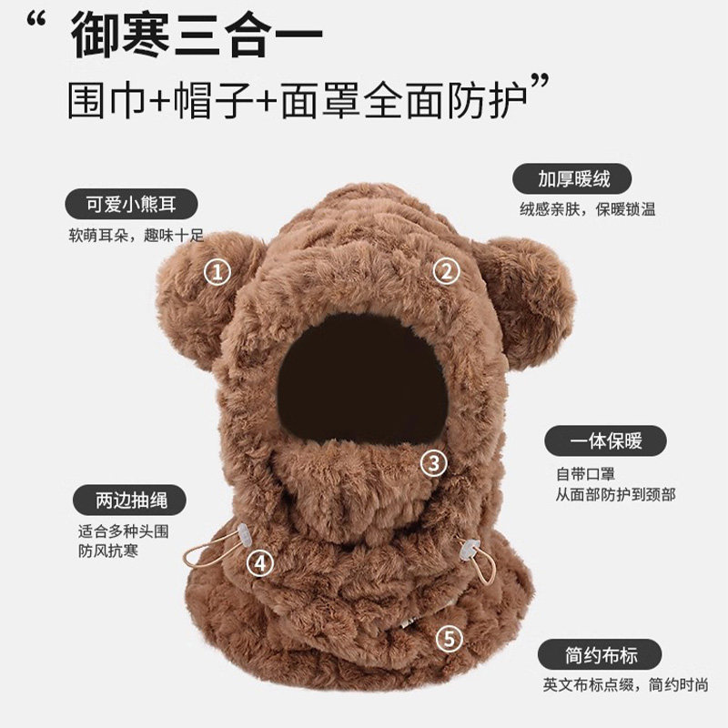 可爱加厚毛绒小熊帽子围巾一体女秋冬季韩版保暖骑车护耳套头帽