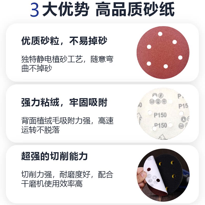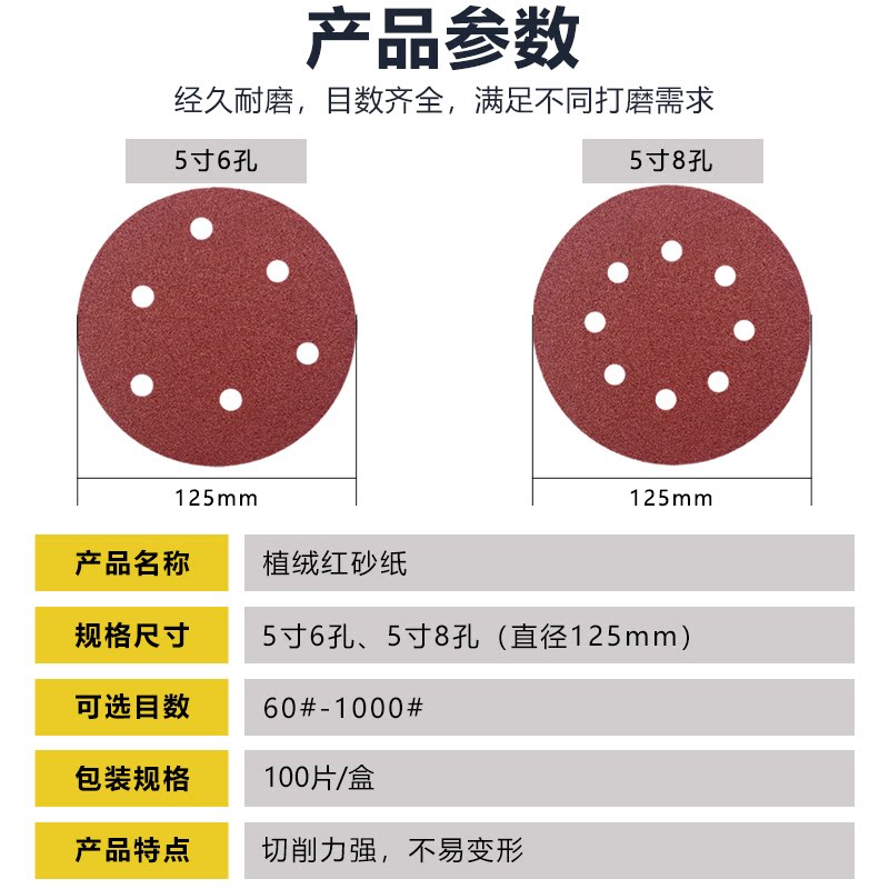 5寸125MM6孔8孔植绒自粘砂纸片干磨机抛光圆盘砂打磨角磨机除锈