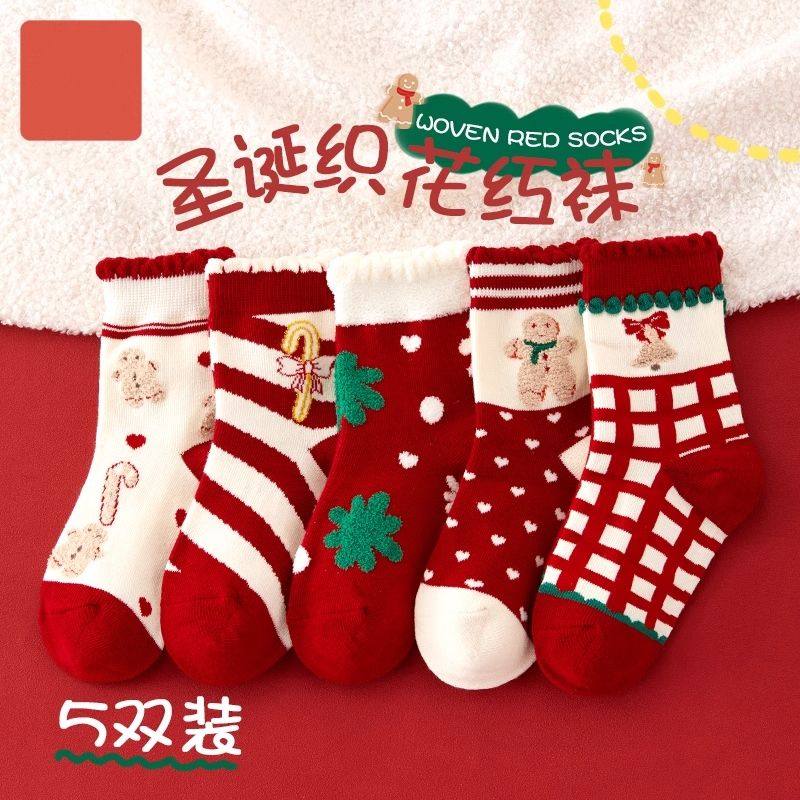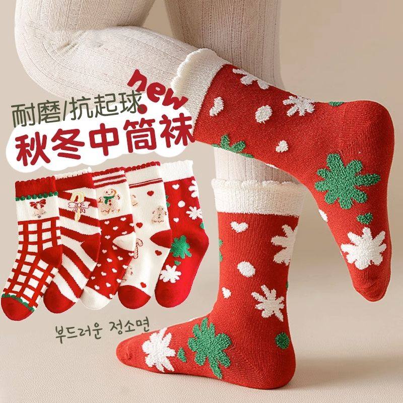 女童袜子儿童秋冬纯棉女孩圣诞红色童袜冬款小童宝宝加厚高筒棉袜