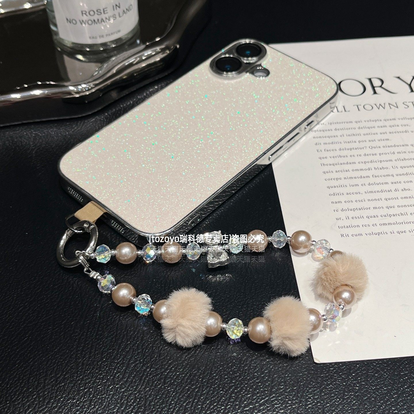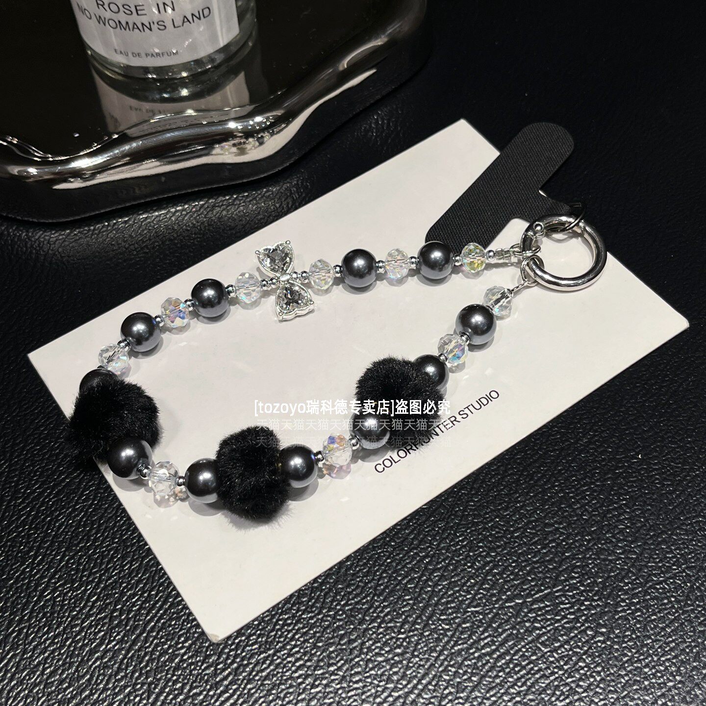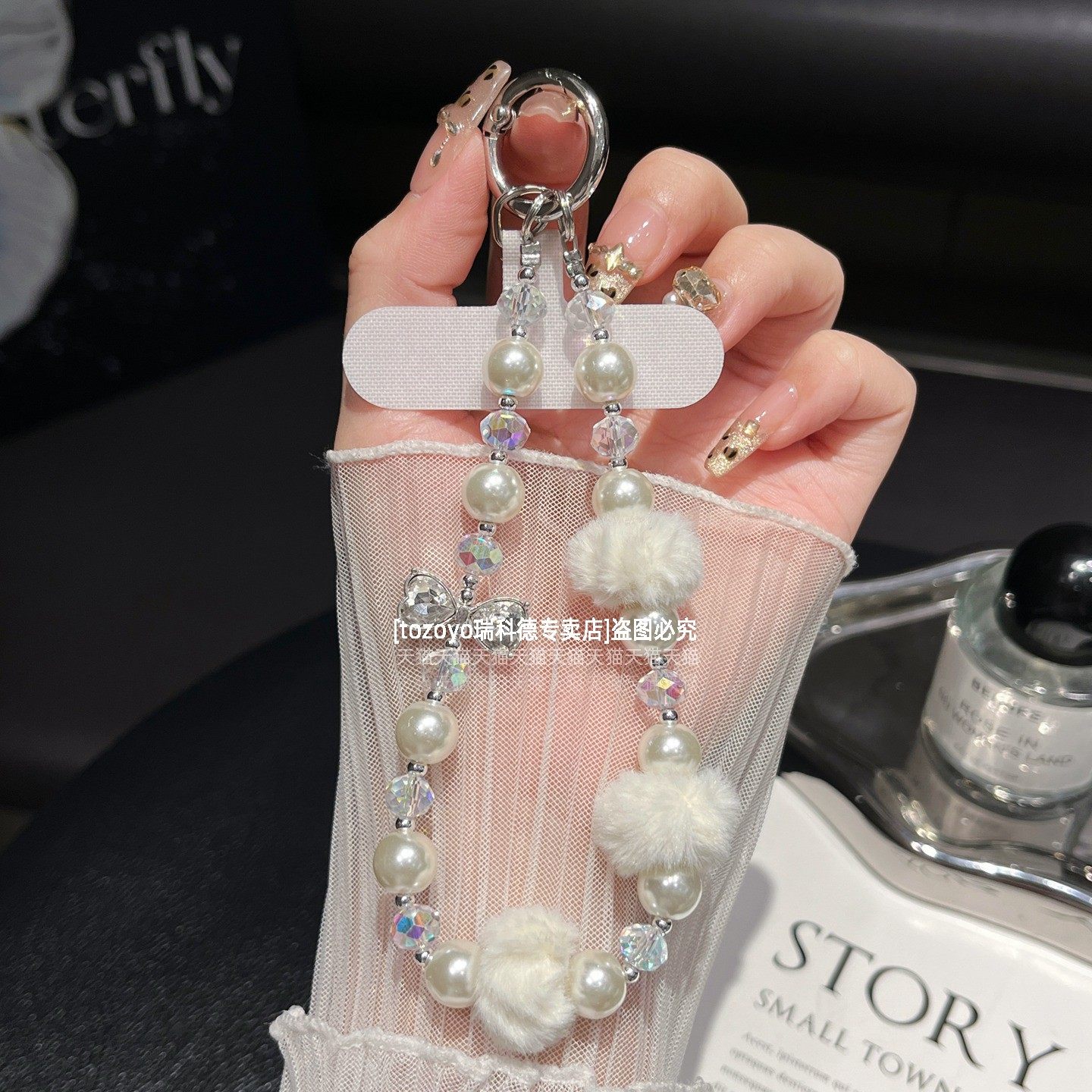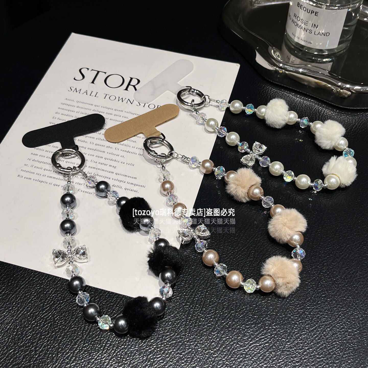 带毛球珍珠手机链2025秋冬新款水晶挂链精致高级感毛绒挂饰水钻蝴蝶结链条好看洋气女串珠手链腕带挂绳包包壳