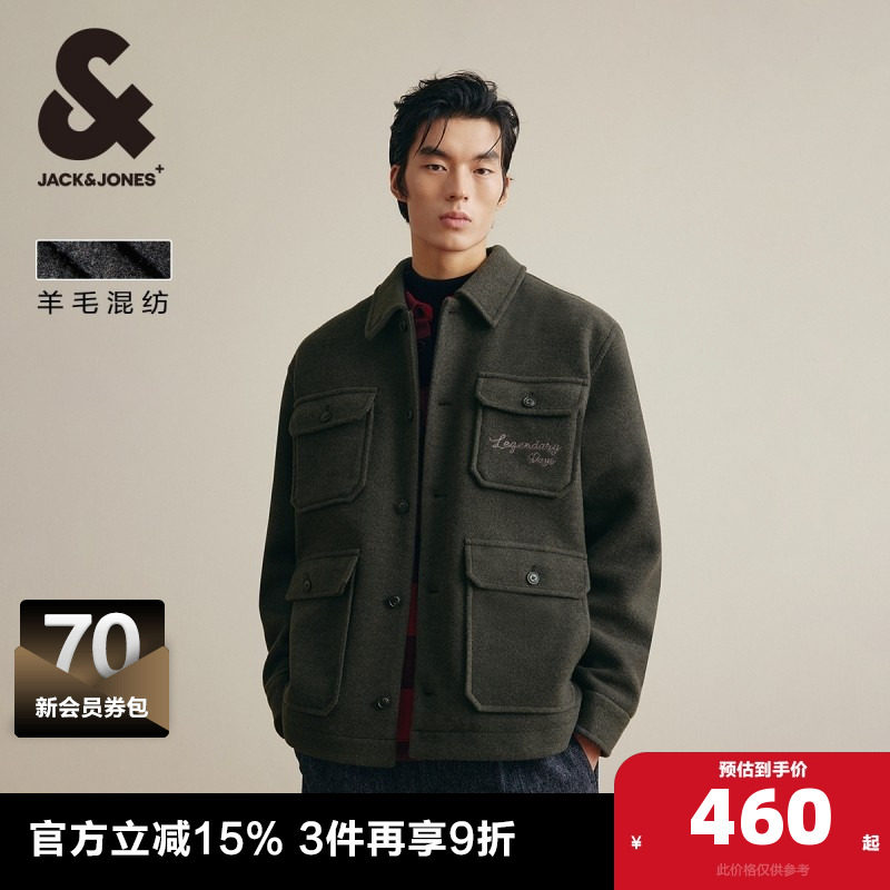 杰克琼斯冬季新款logo刺绣皮标宽松毛呢大衣男装