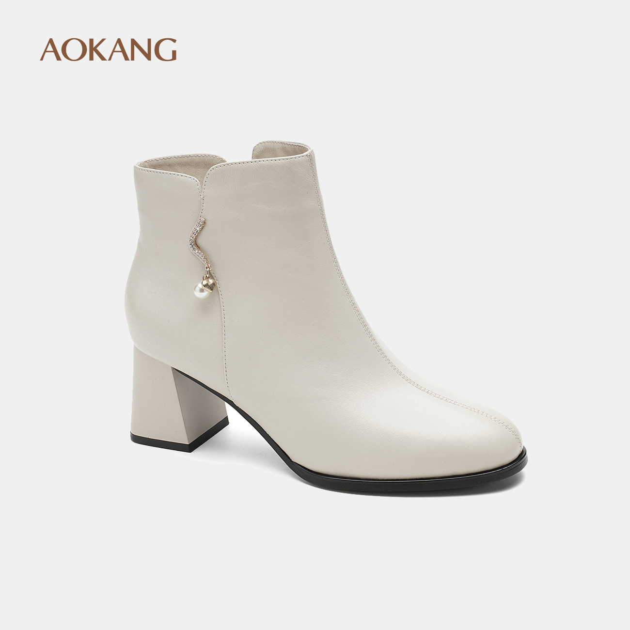 奥康 女鞋冬季真皮漆面气质短靴尖头粗跟时装靴门店发货