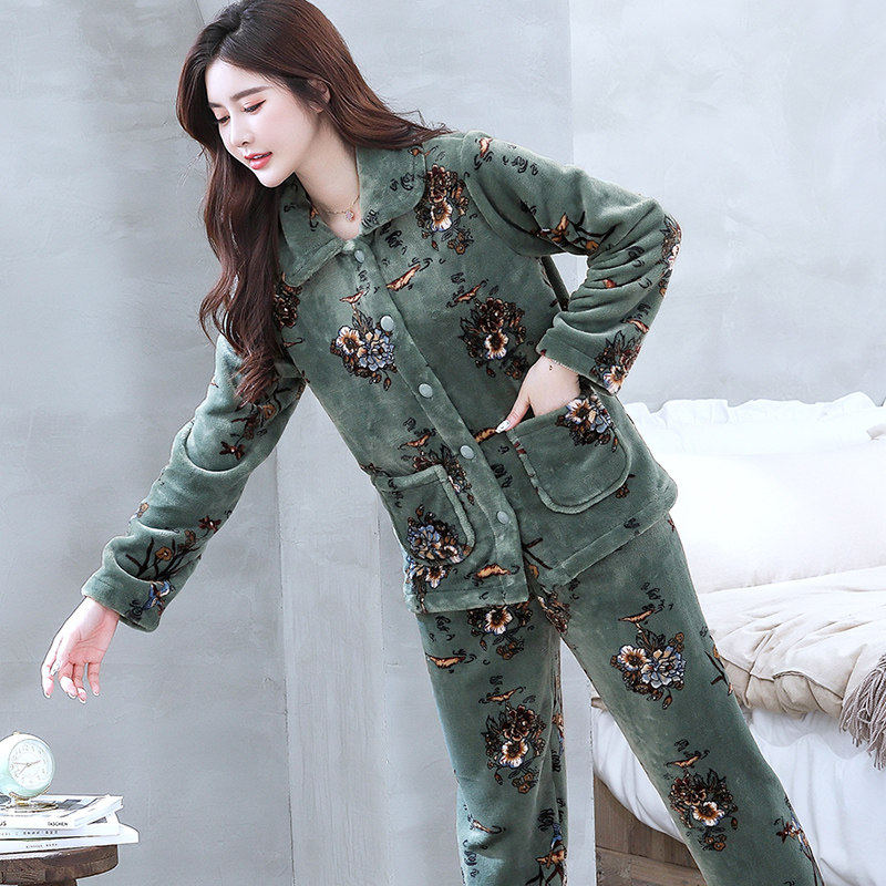 红豆珊瑚绒加厚加绒女士睡衣套装秋冬款长袖保暖法兰绒可外穿家居