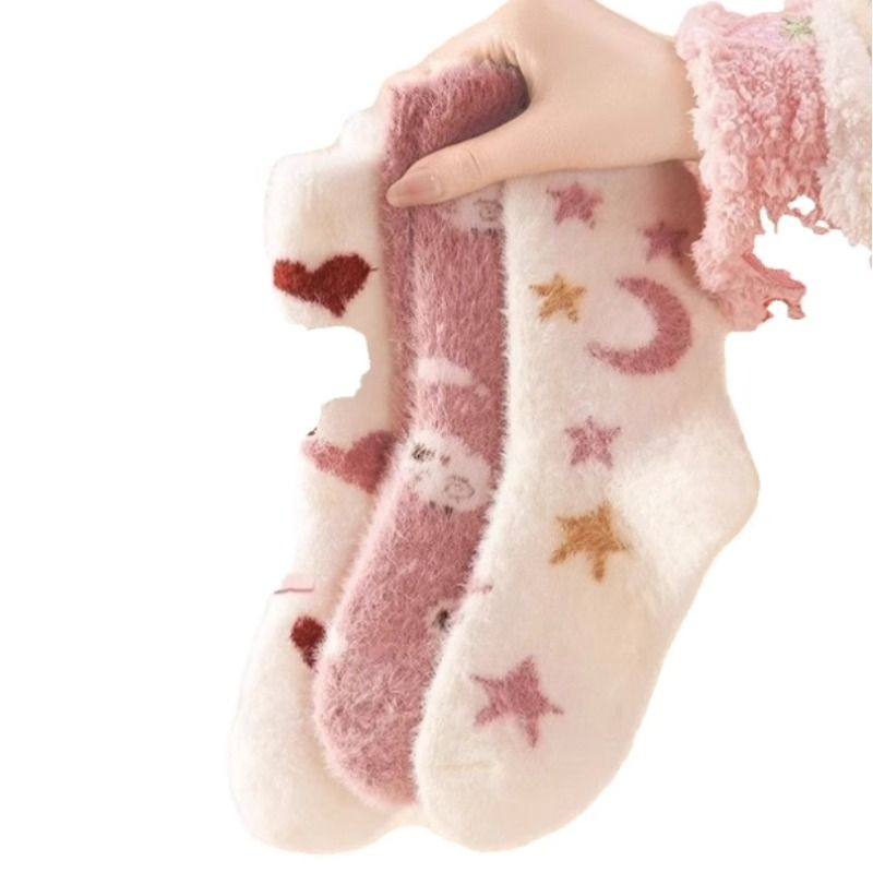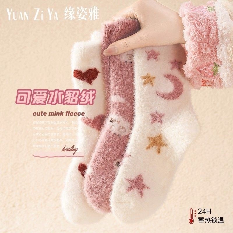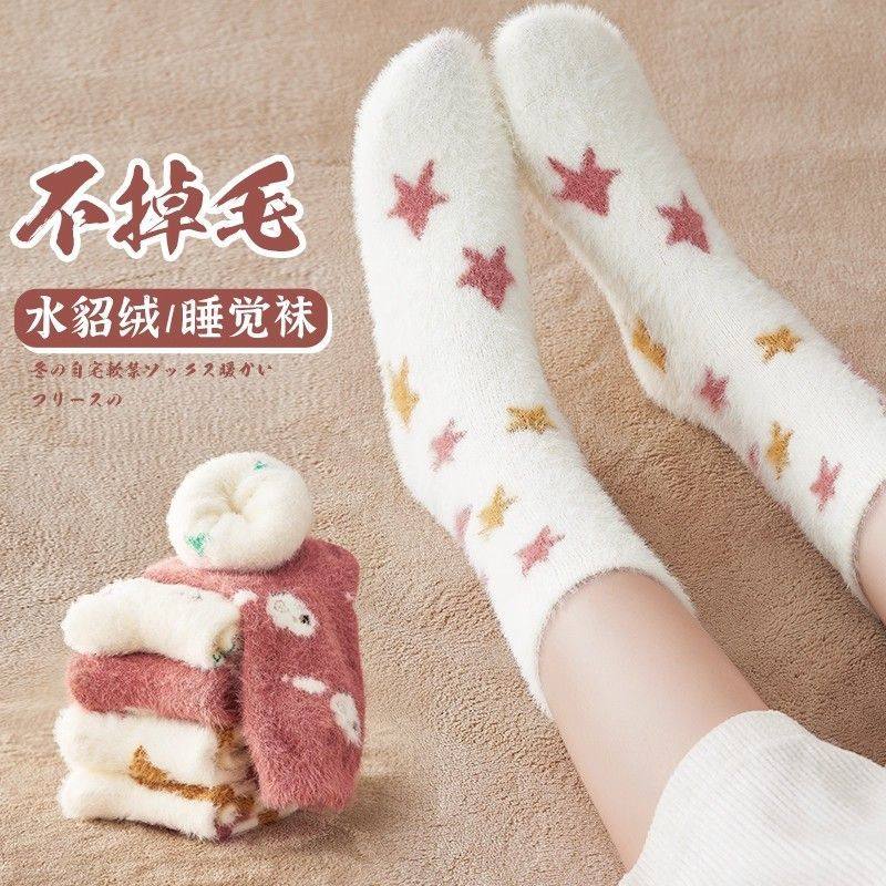 女童可爱水貂绒袜子秋冬季保暖中筒地板袜加绒加厚冬天睡眠袜防滑