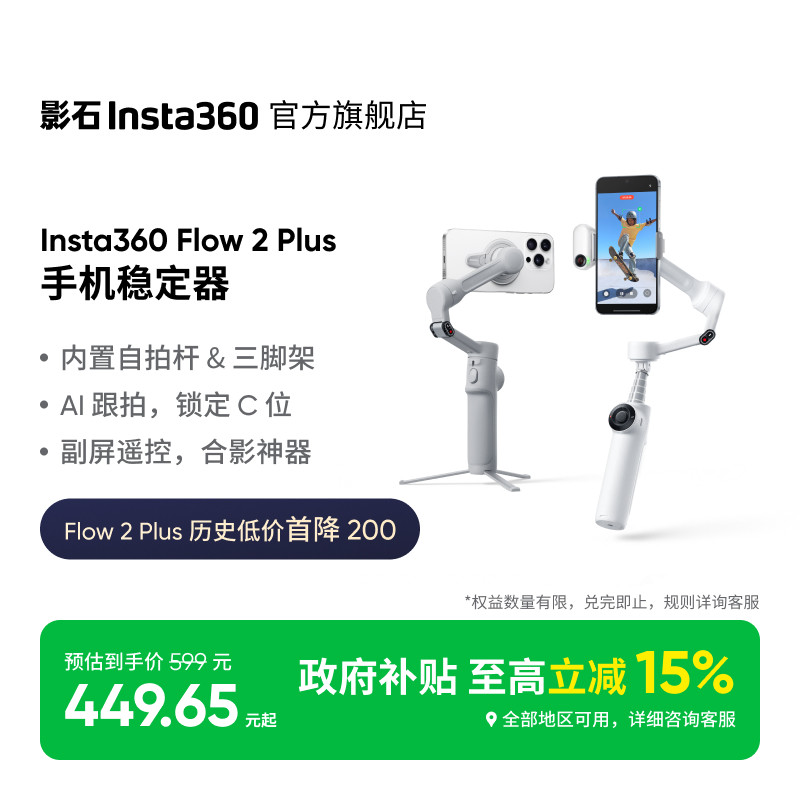 【至高优惠200元】影石Insta360 Flow 2/Flow 2 Plus手机稳定器手持云台AI跟拍防抖三脚架视频神器便携自拍杆