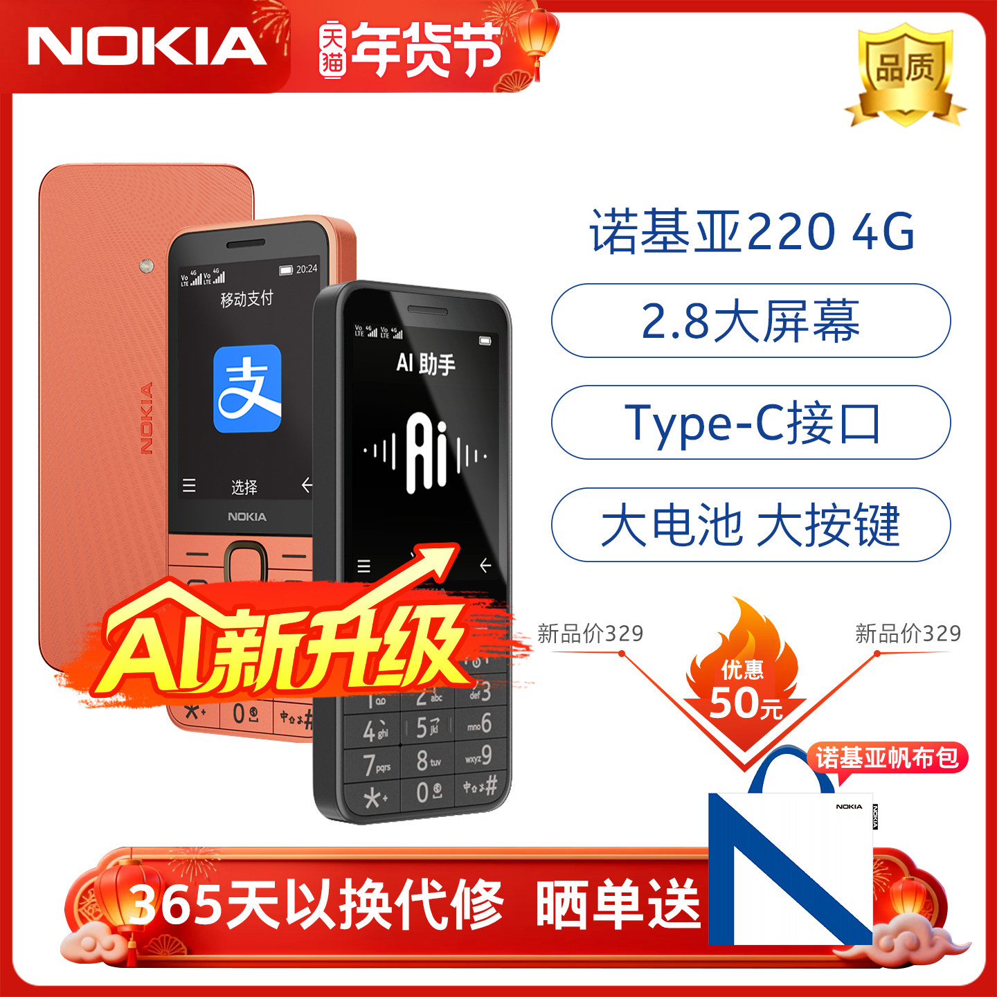 【新品2.8大屏】诺基亚220 4g老年老人手机小初高中生按键大声音超长待机电信学生老年机官方旗舰店2024新款