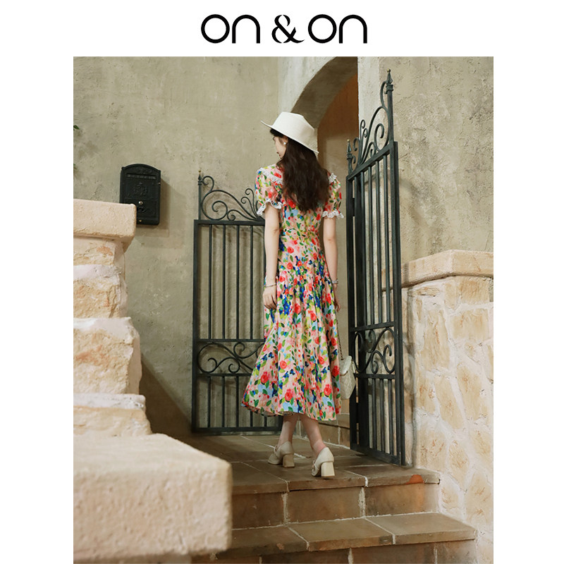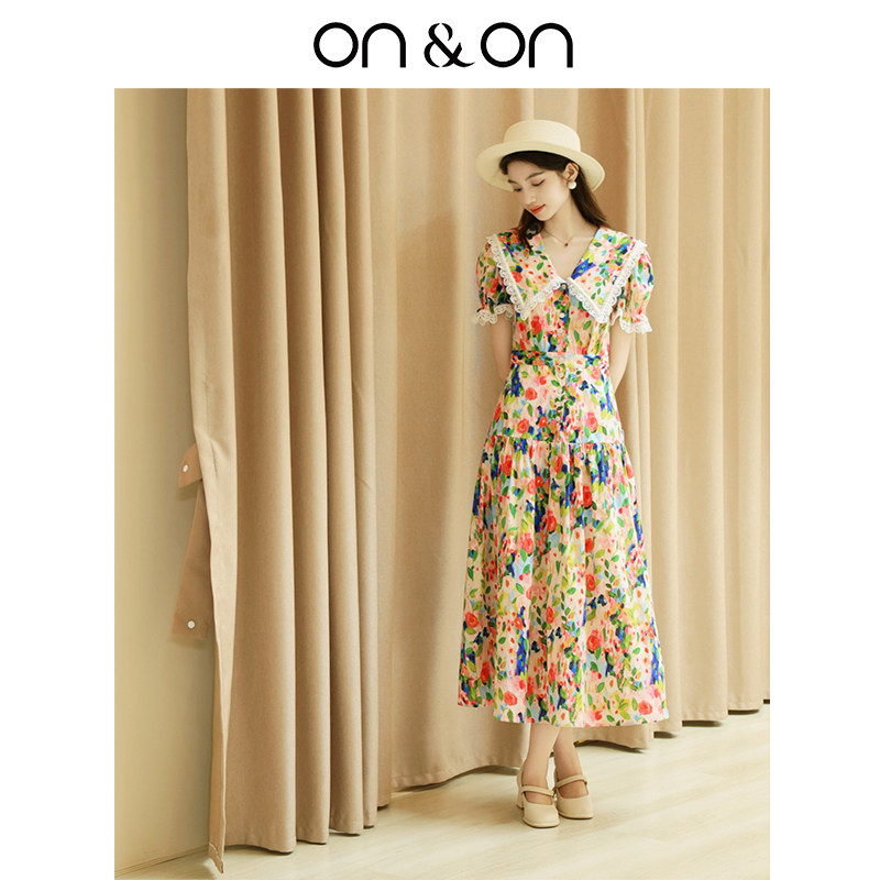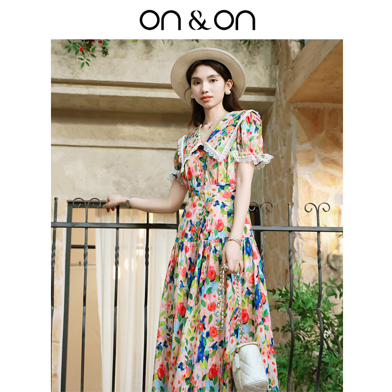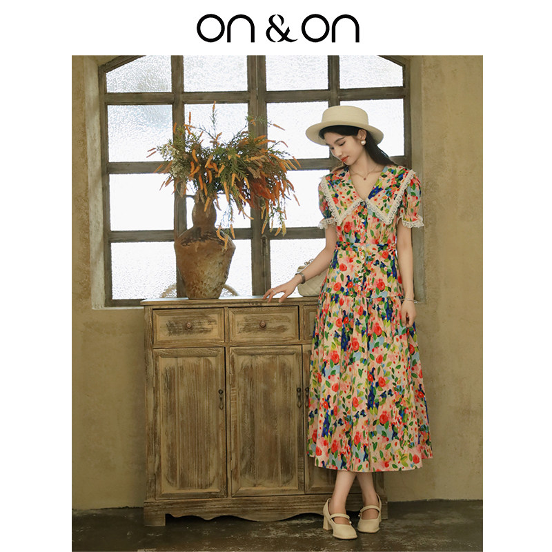 ON&ON/安乃安【天猫限定】100%棉法式时尚碎花油画裙女拼接蕾丝