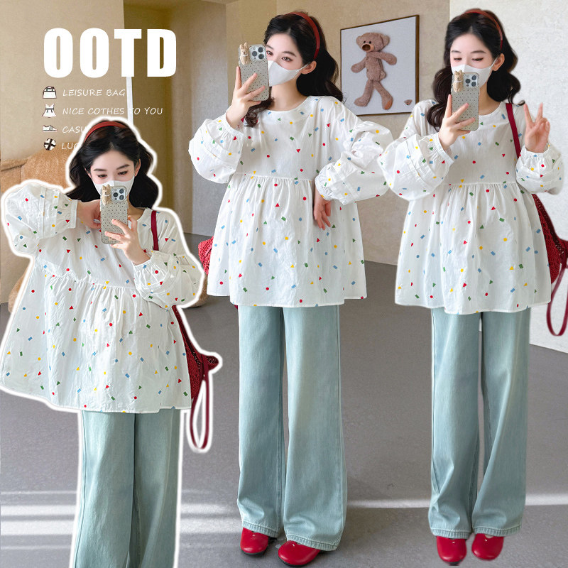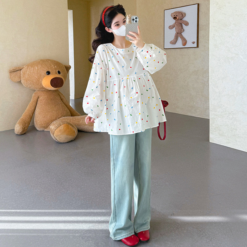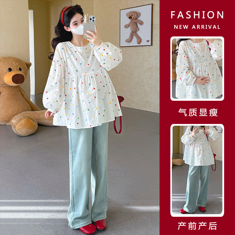 婧麒孕妇装娃娃衫宽松显瘦衬衣上衣洋气遮孕肚几何波点长袖上衣女