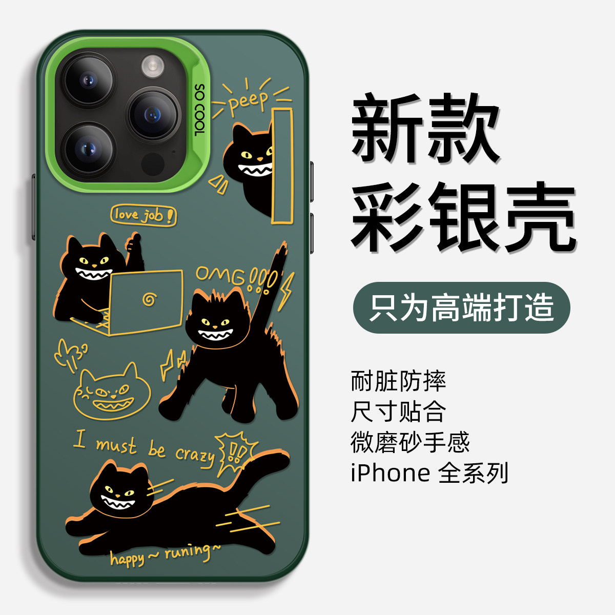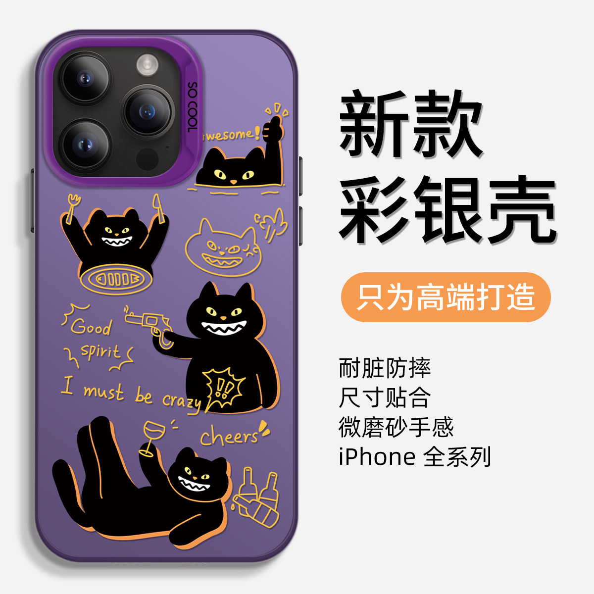 黑色猫咪适用苹果17promax手机壳iphone15pro网红14/11高级12磨砂16plus高级感全包防摔动漫卡通可爱镭射imd