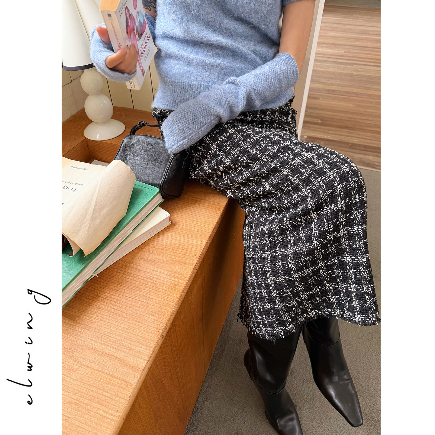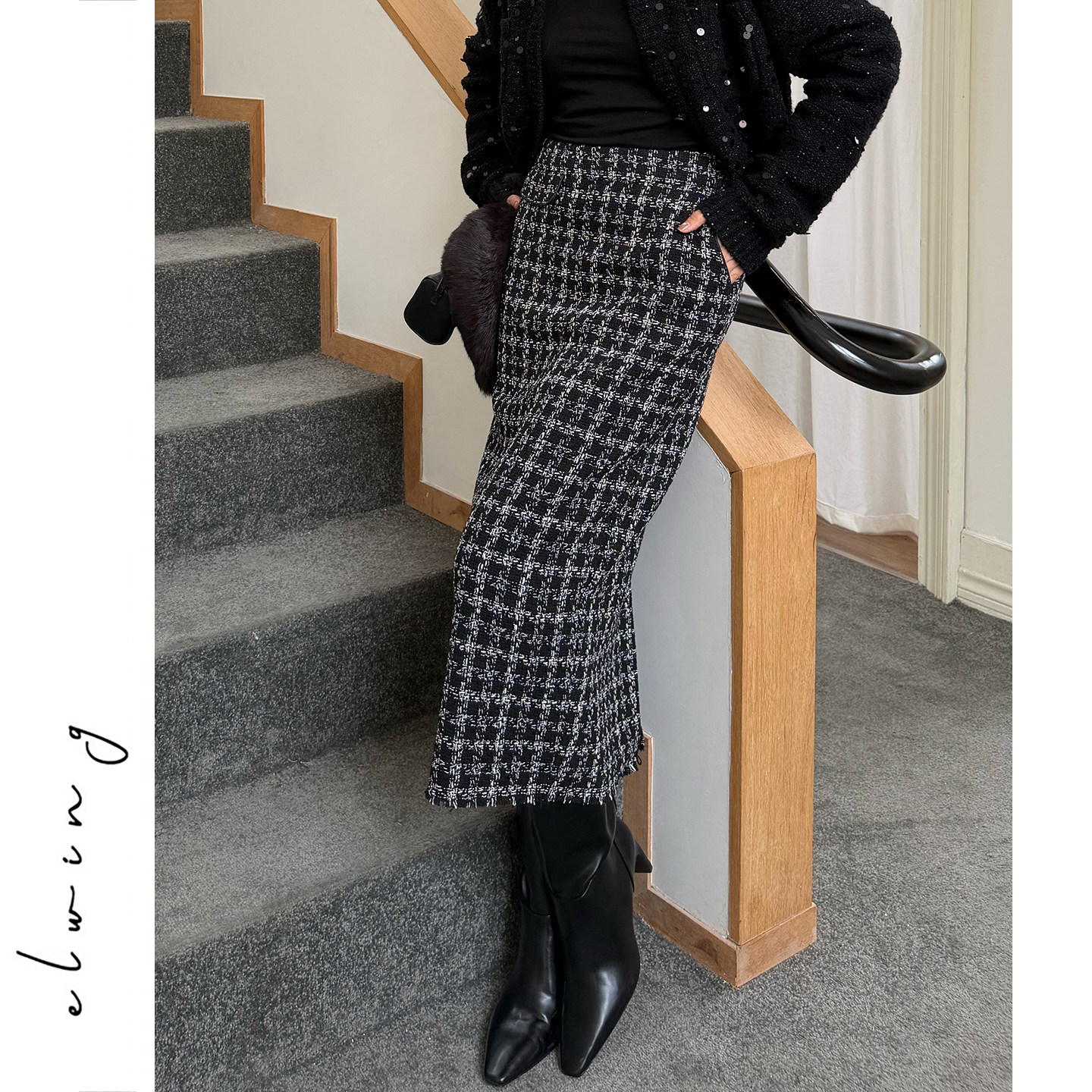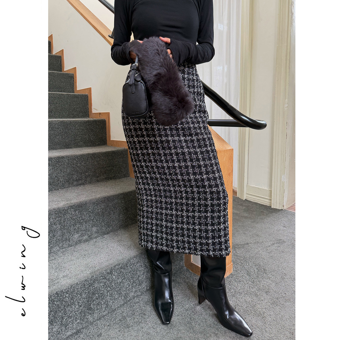 Elwing原创复古优雅包臀小香风时尚新款裙子黑白格纹编织半身裙