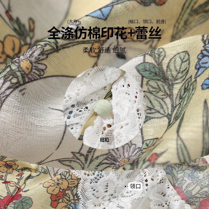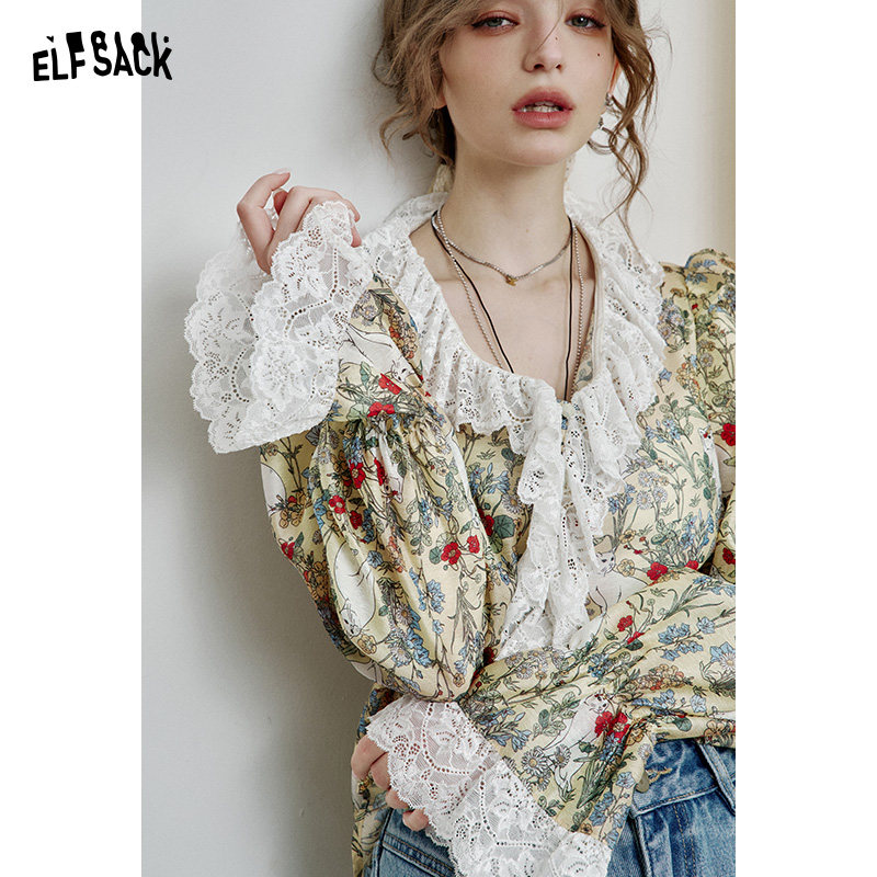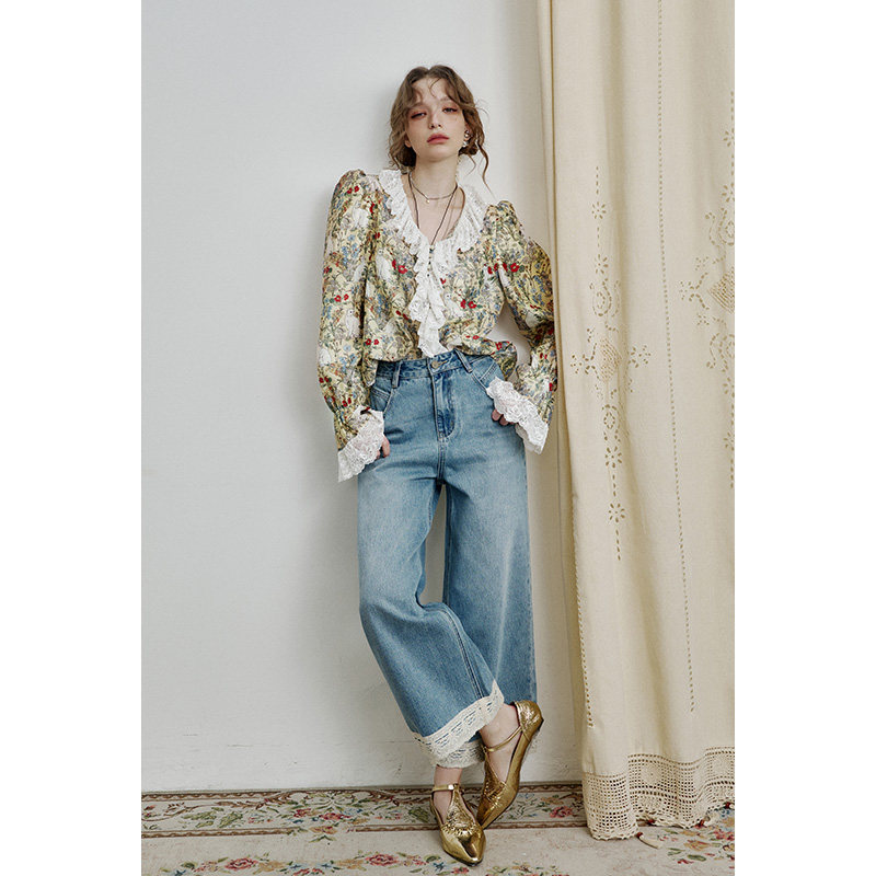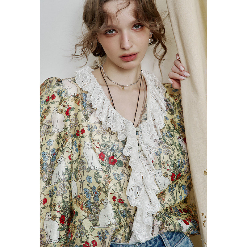 妖精的口袋原创满印蕾丝拼接衬衫女2025年春秋新款设计感雪纺衫