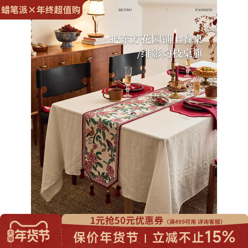 【孤品】蜡笔派绯影灼枝桌旗法式复古新年轻奢餐桌长条盖布定制