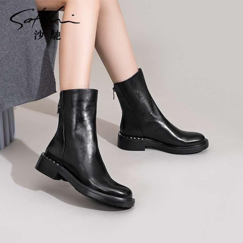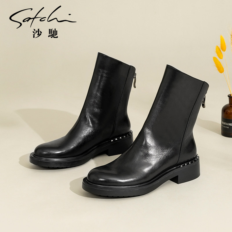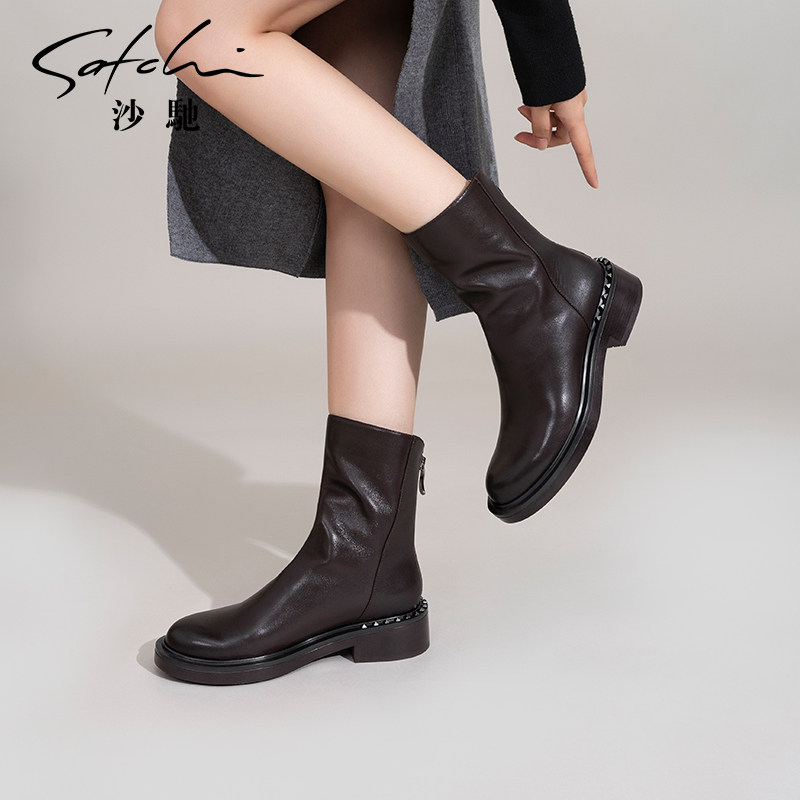 沙驰女鞋羊皮倒靴中粗跟时装靴短靴2025秋冬新款后拉链短筒瘦瘦靴