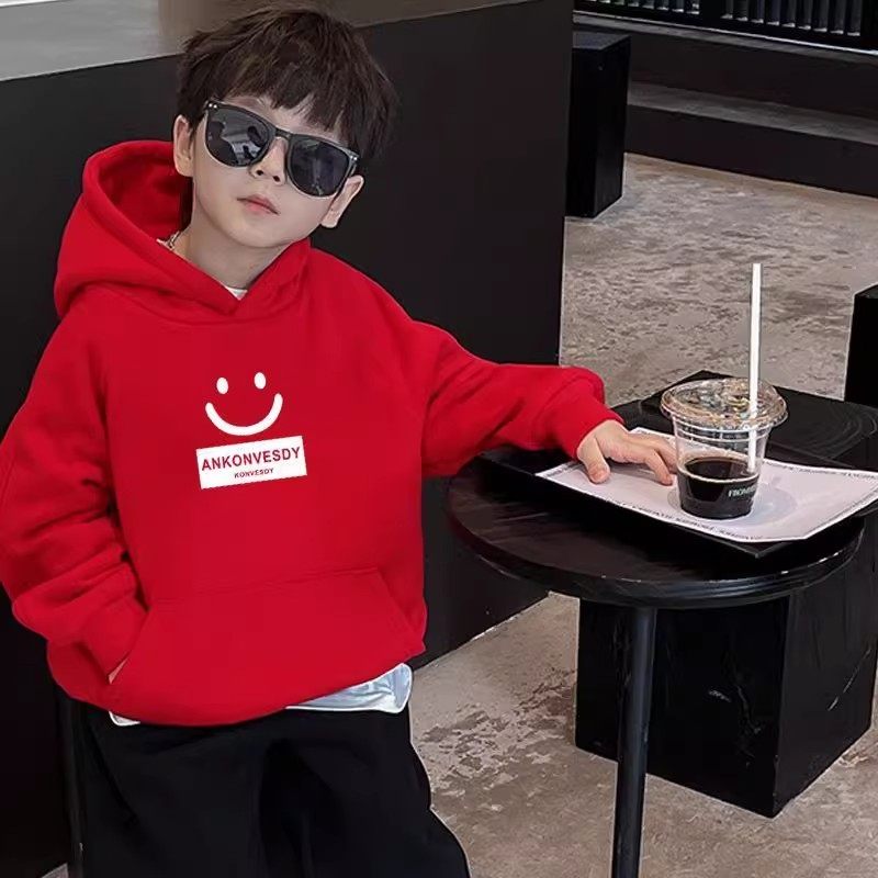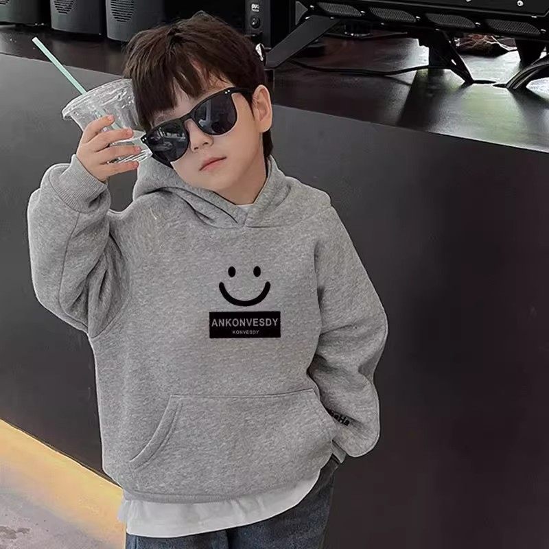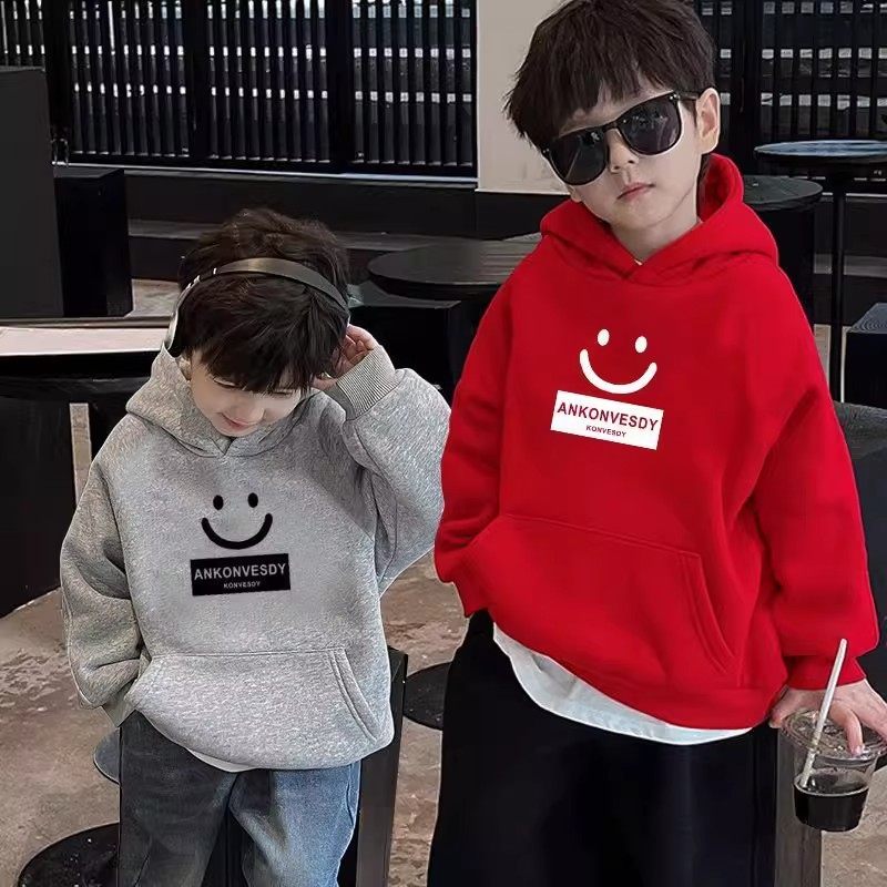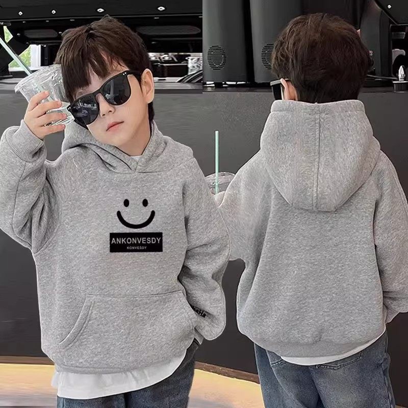 男童冬季加绒加厚连帽卫衣儿童一体绒上衣中大童保暖绒衫红色灰色