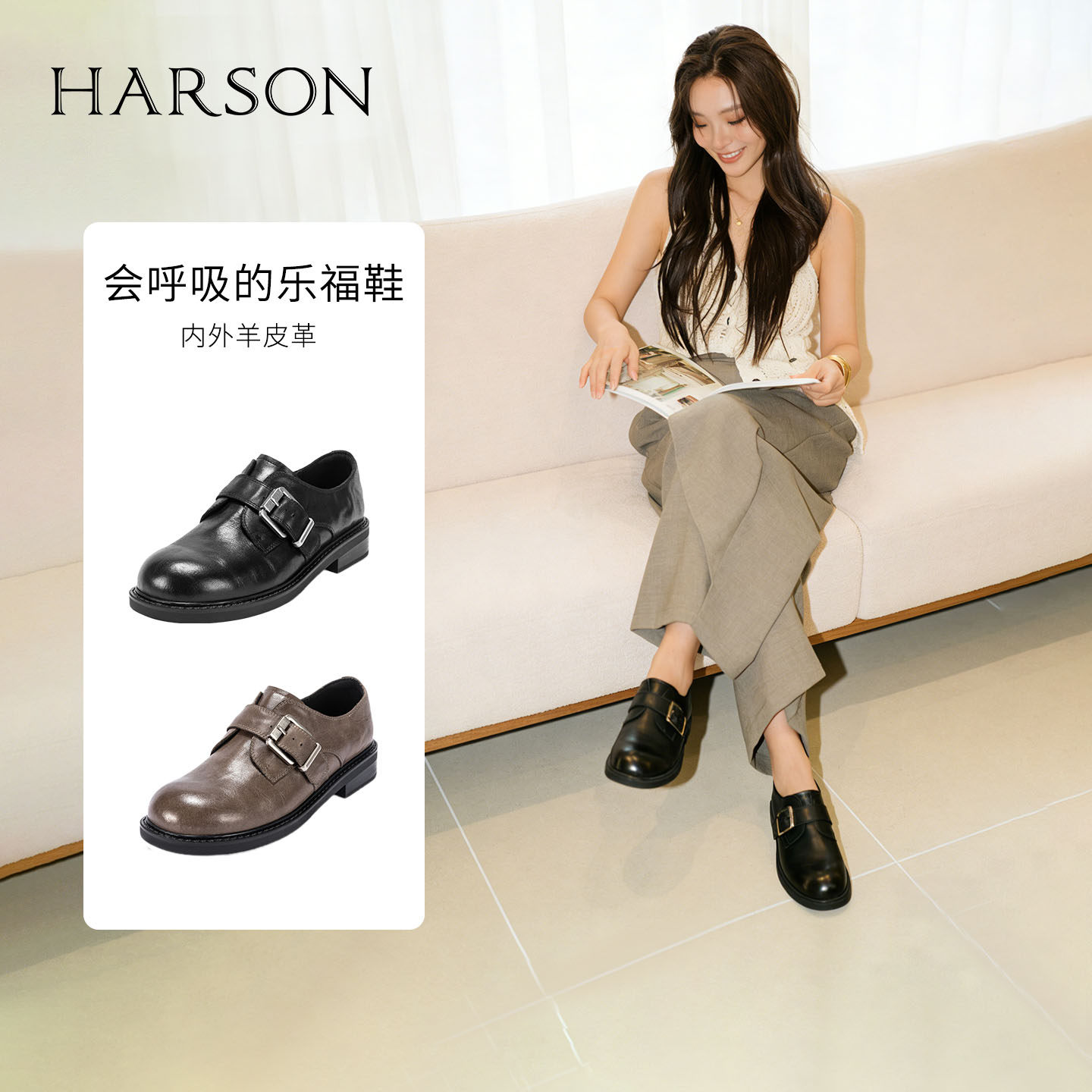哈森/HARSON【爵士乐福鞋】春新款皮带扣复古上班通勤黑色皮鞋