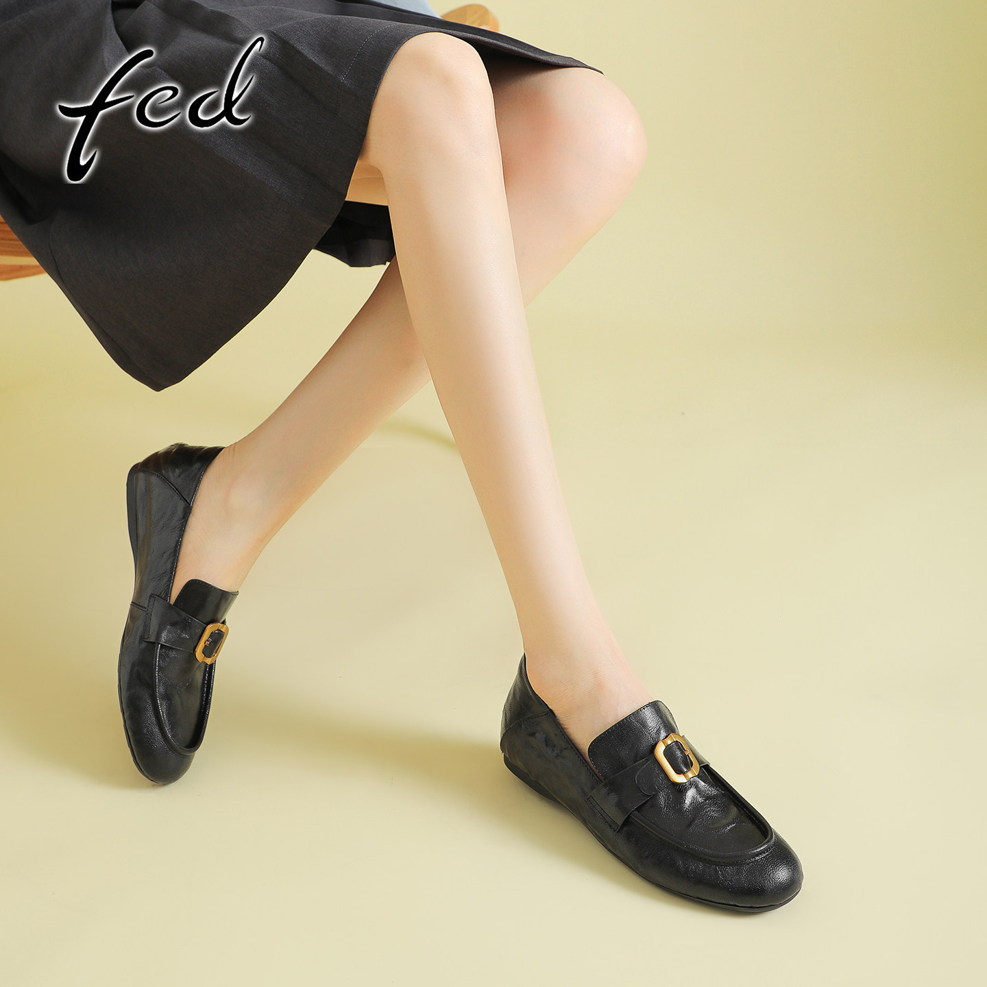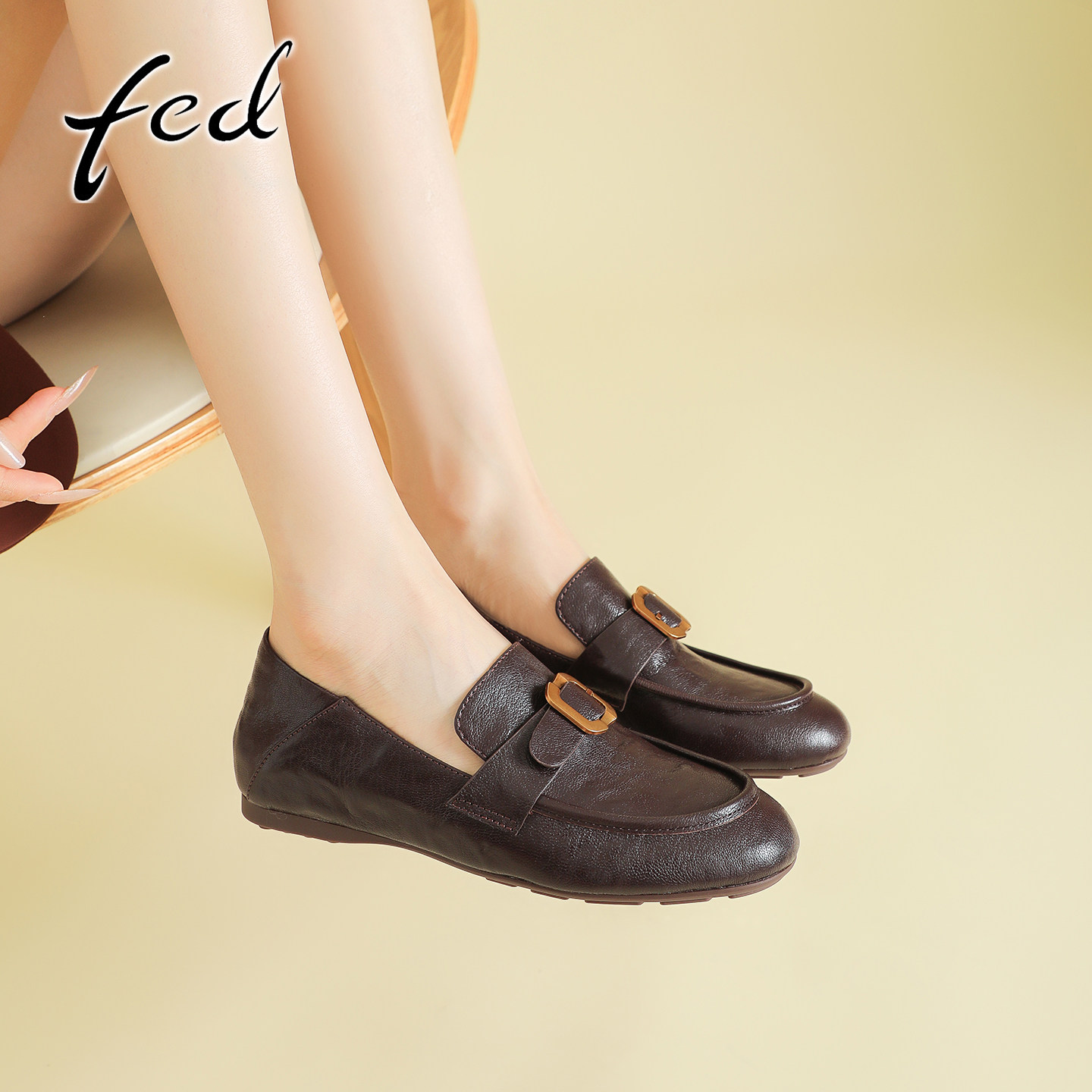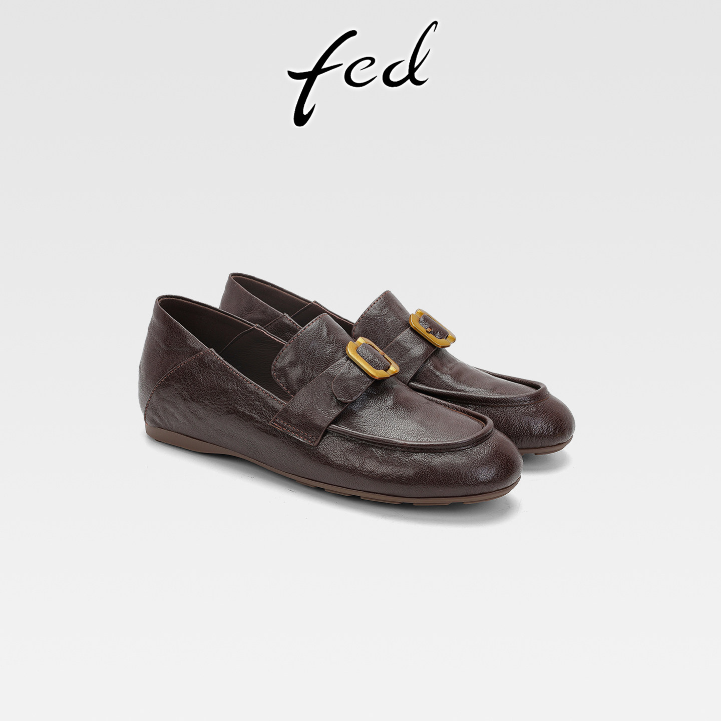 fed真皮软底乐福鞋女复古皮带扣小皮鞋一脚蹬内增高圆头深口单鞋