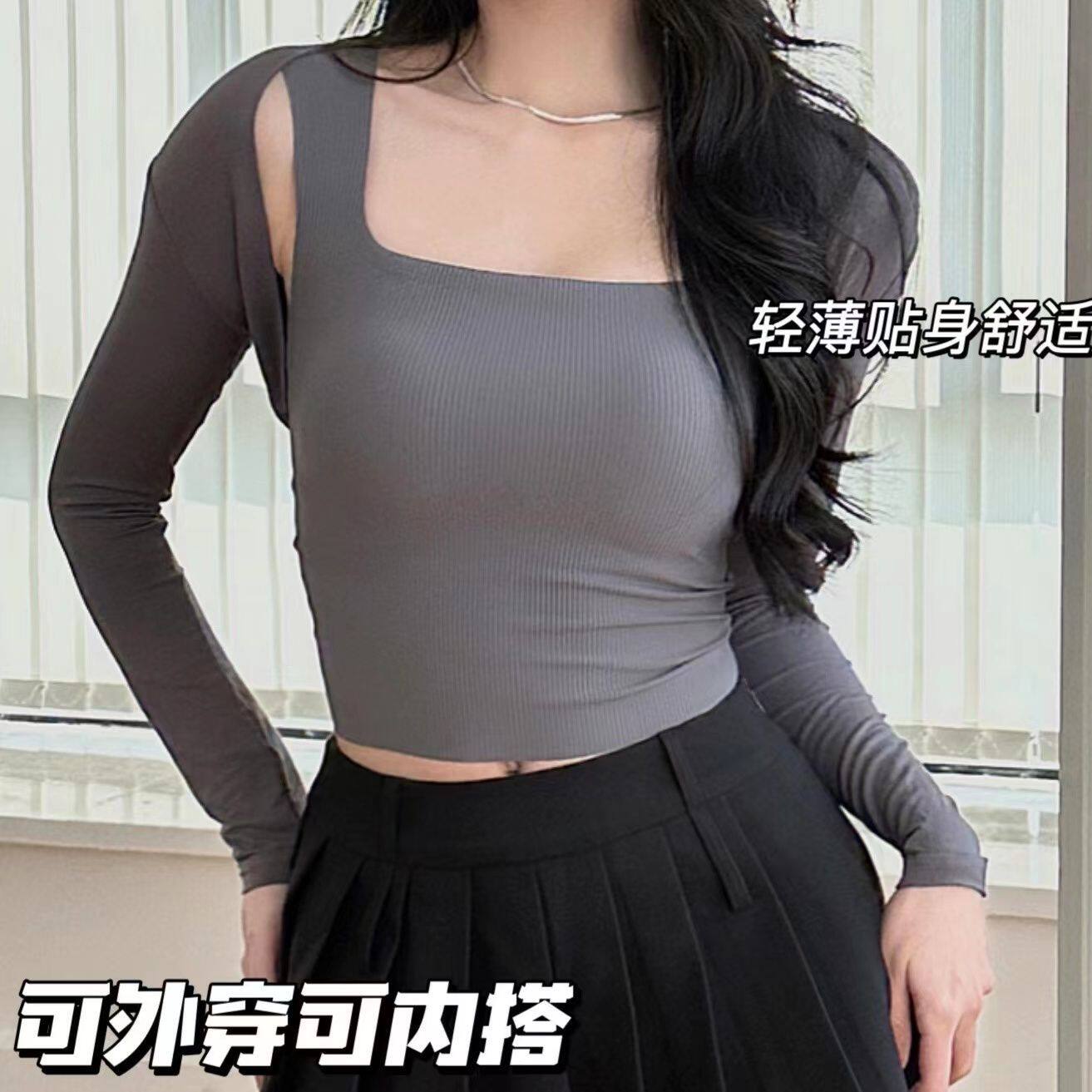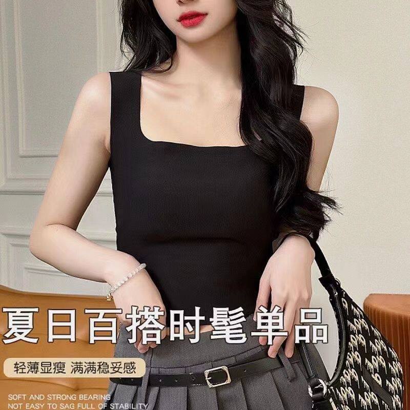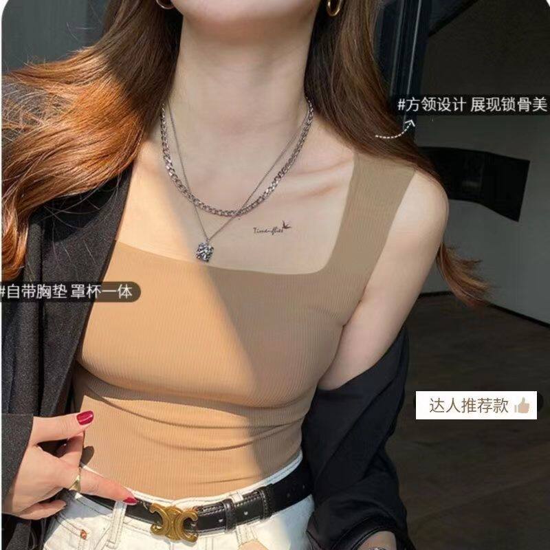 冰丝背心方领一体无痕吊带大码胸垫打底上衣外穿螺纹遮副乳文胸