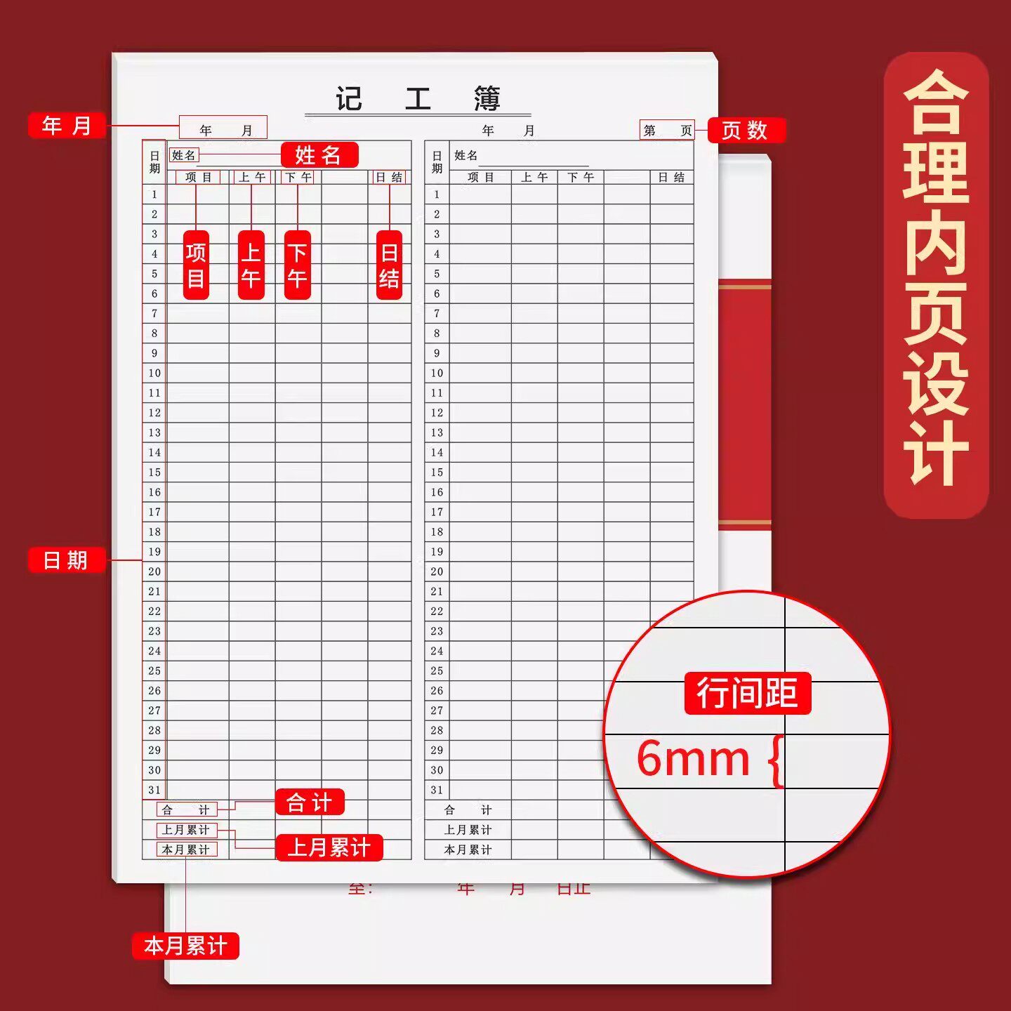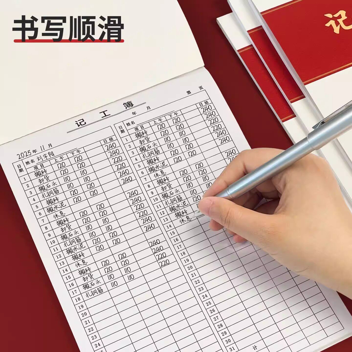 记工本31天带备注明细表记工薄建筑工人工地考勤表加厚款出勤登记表个人签到本上班签到记录表临时工工时登记