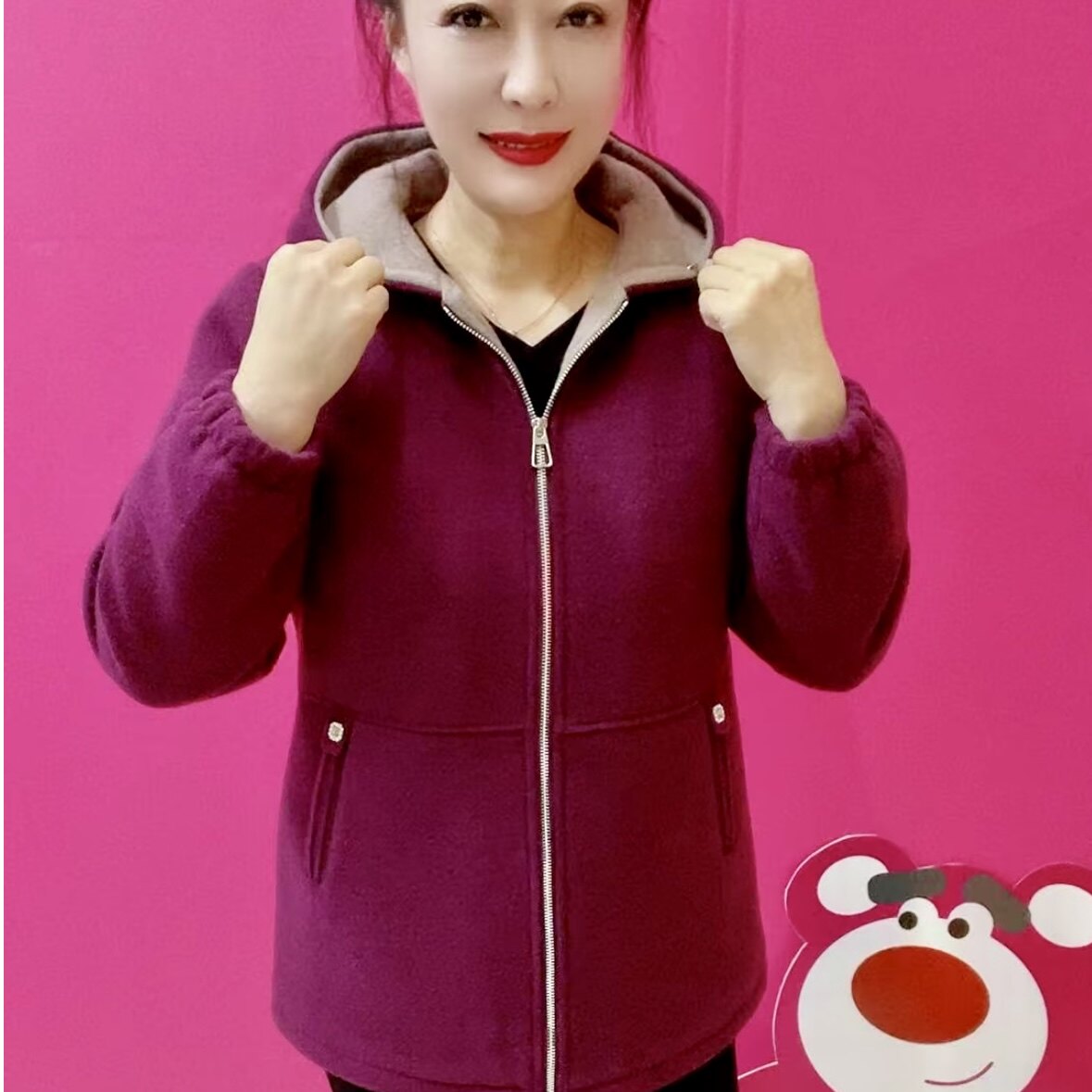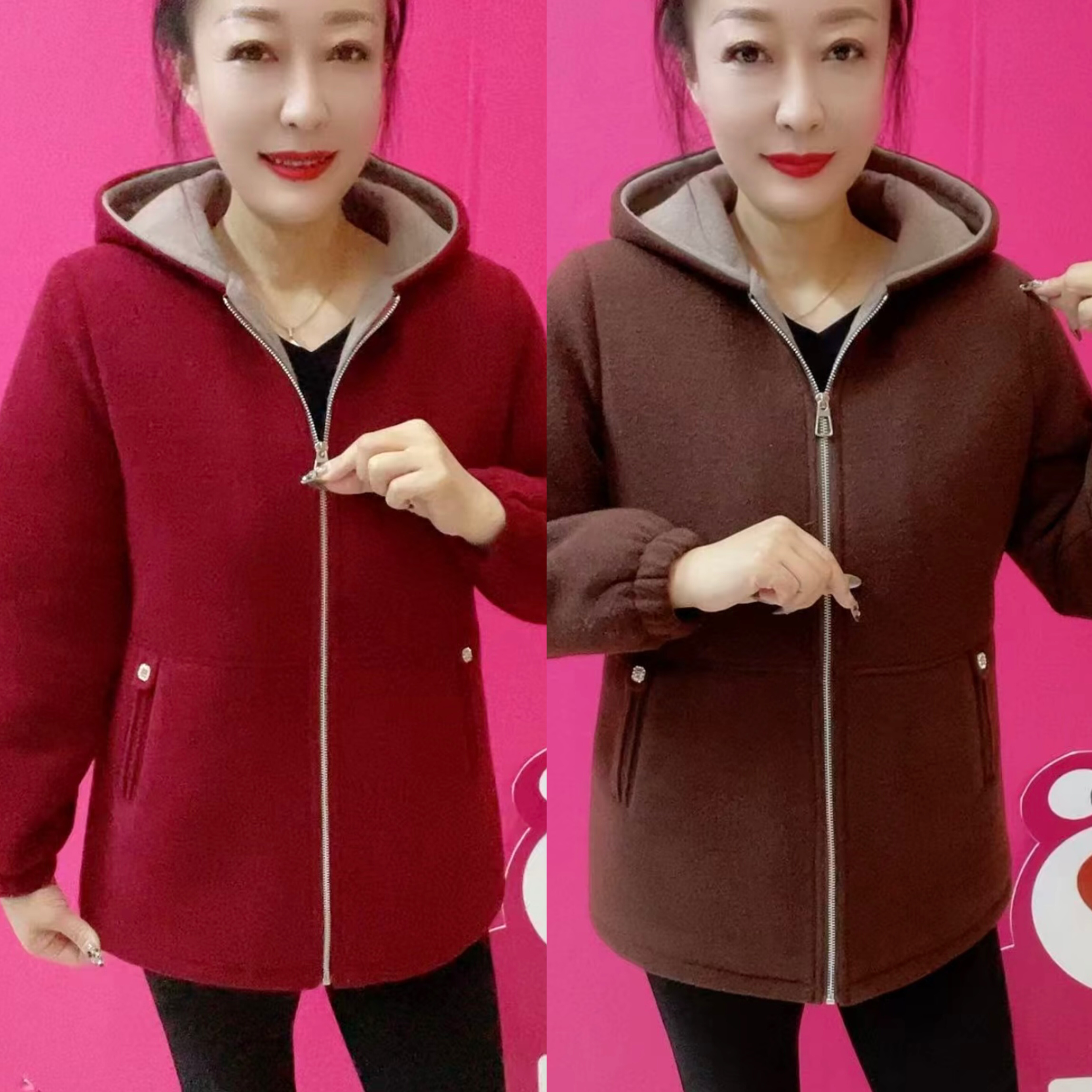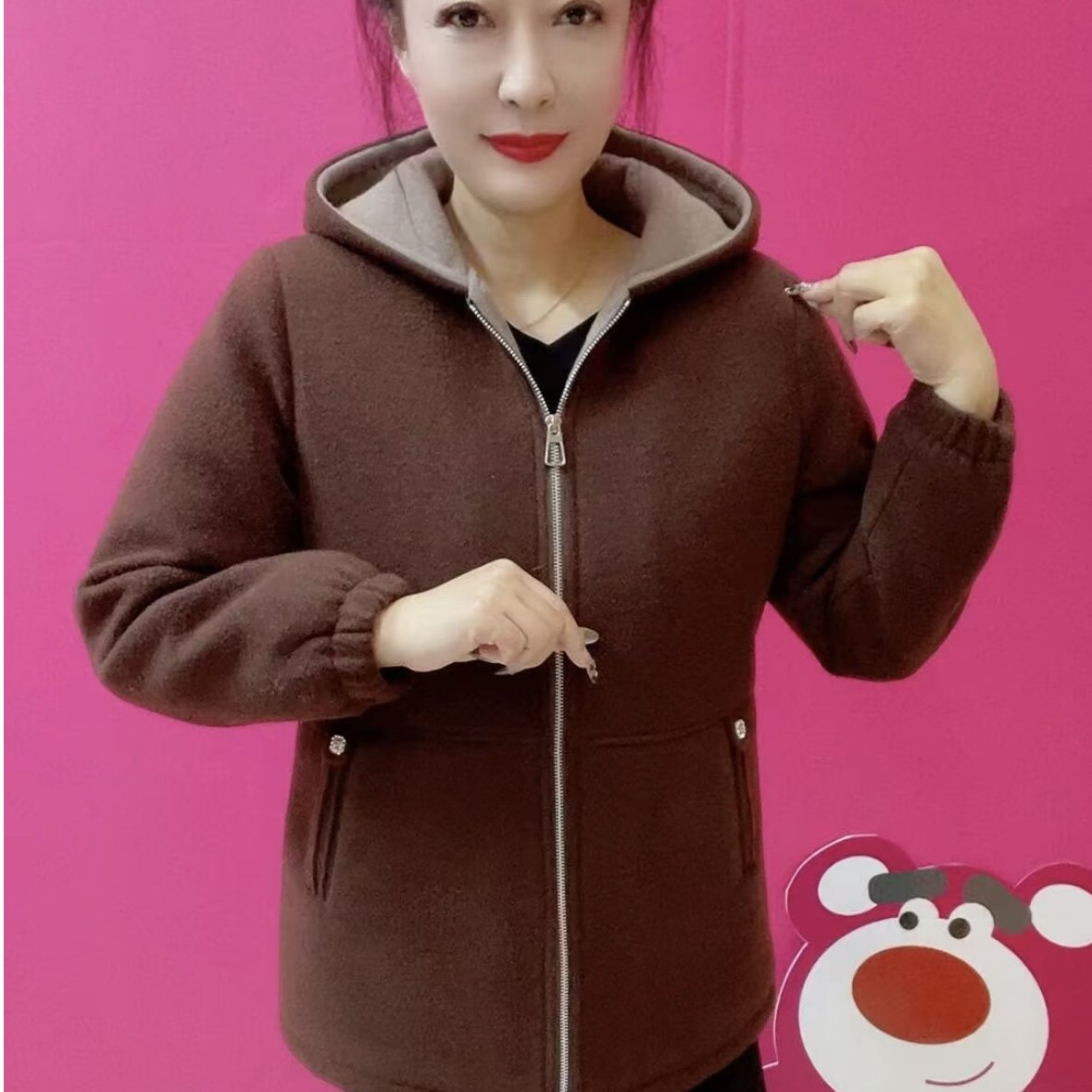 妈妈秋冬加绒加厚连帽外套女中老年人大码时尚宽松颗粒绒保暖上衣