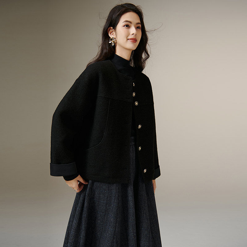 晚白2025年冬新款复古拼接圆领羊毛上衣宽松圈圈毛质感外套女