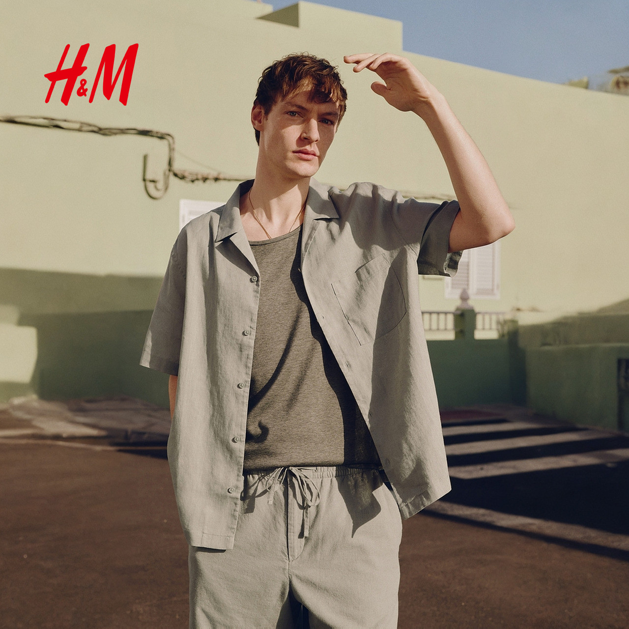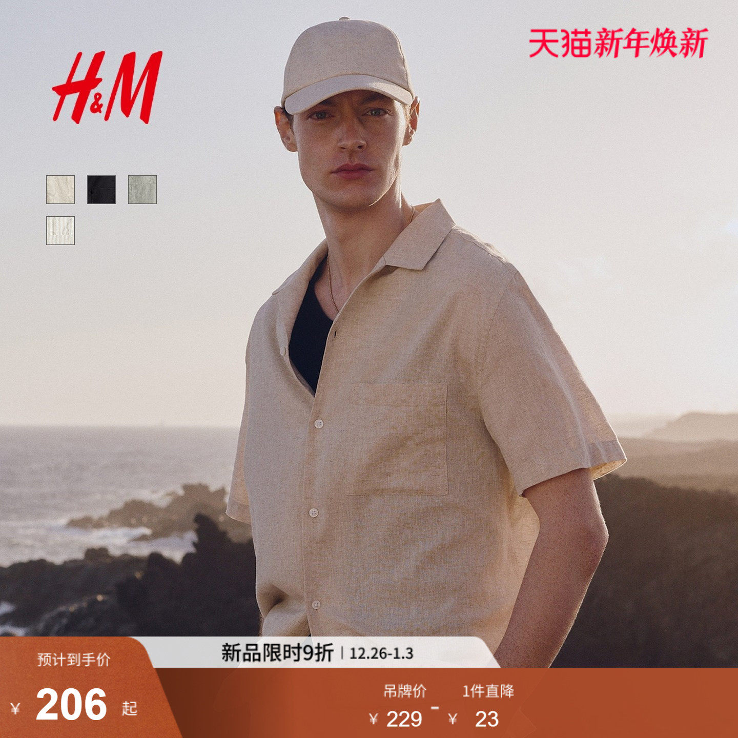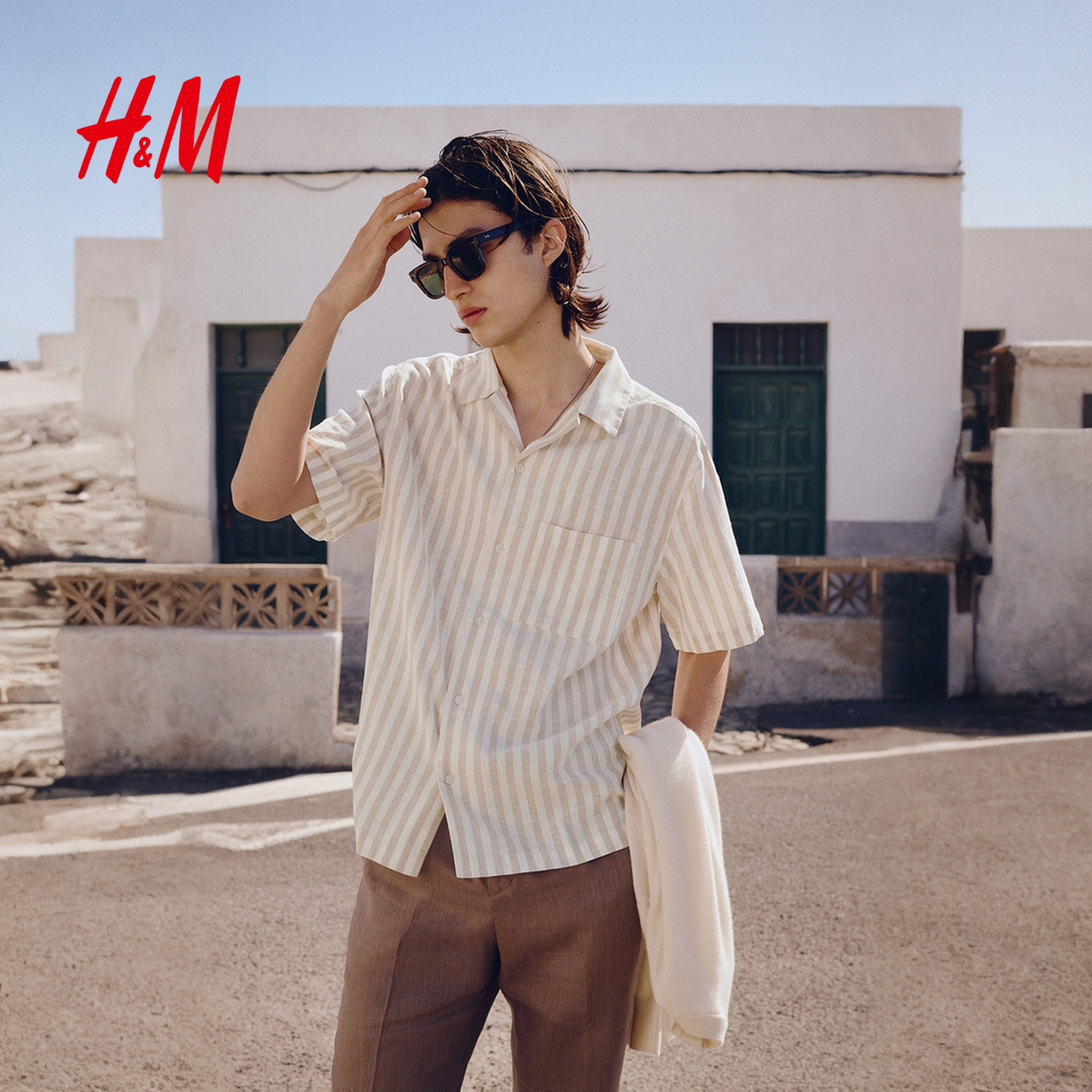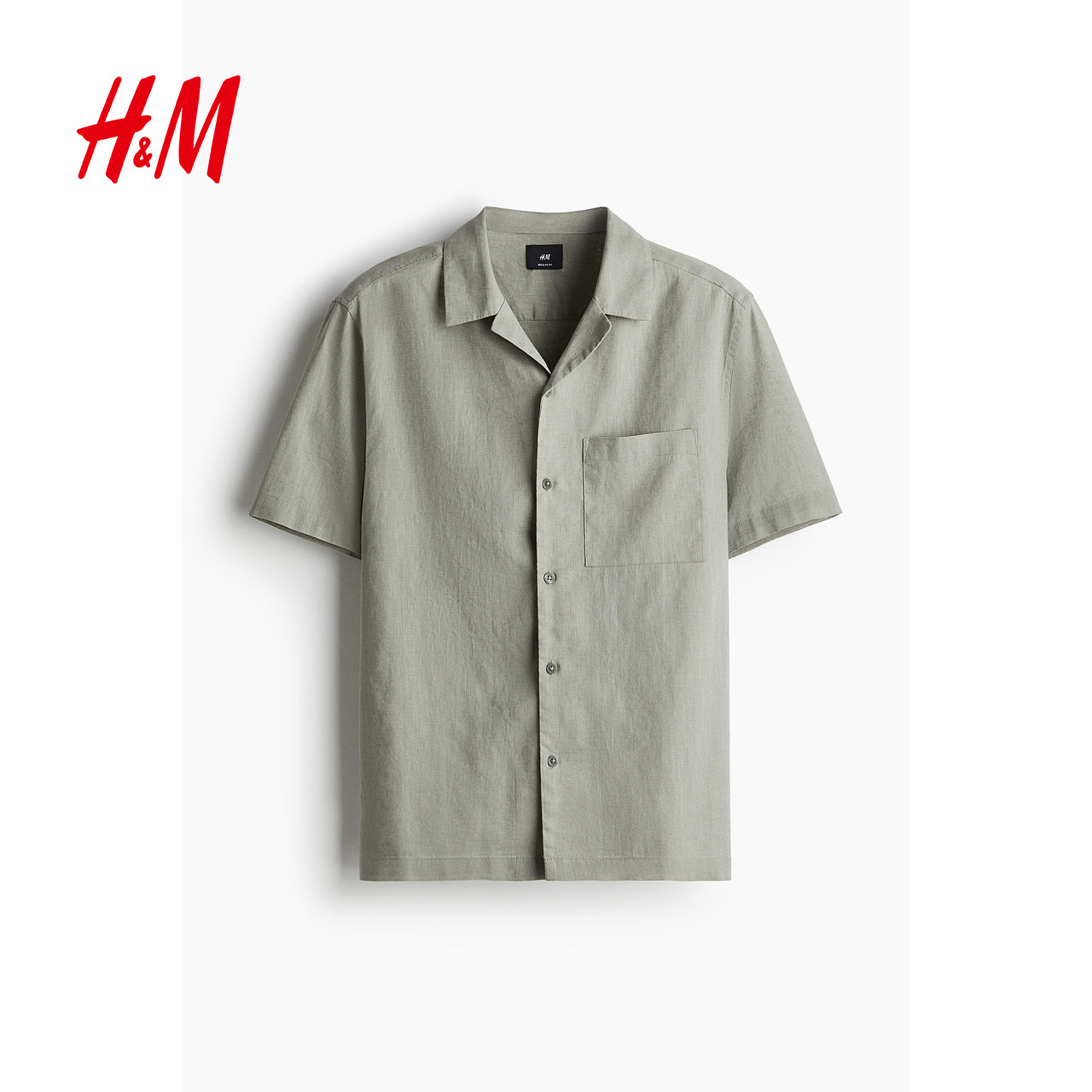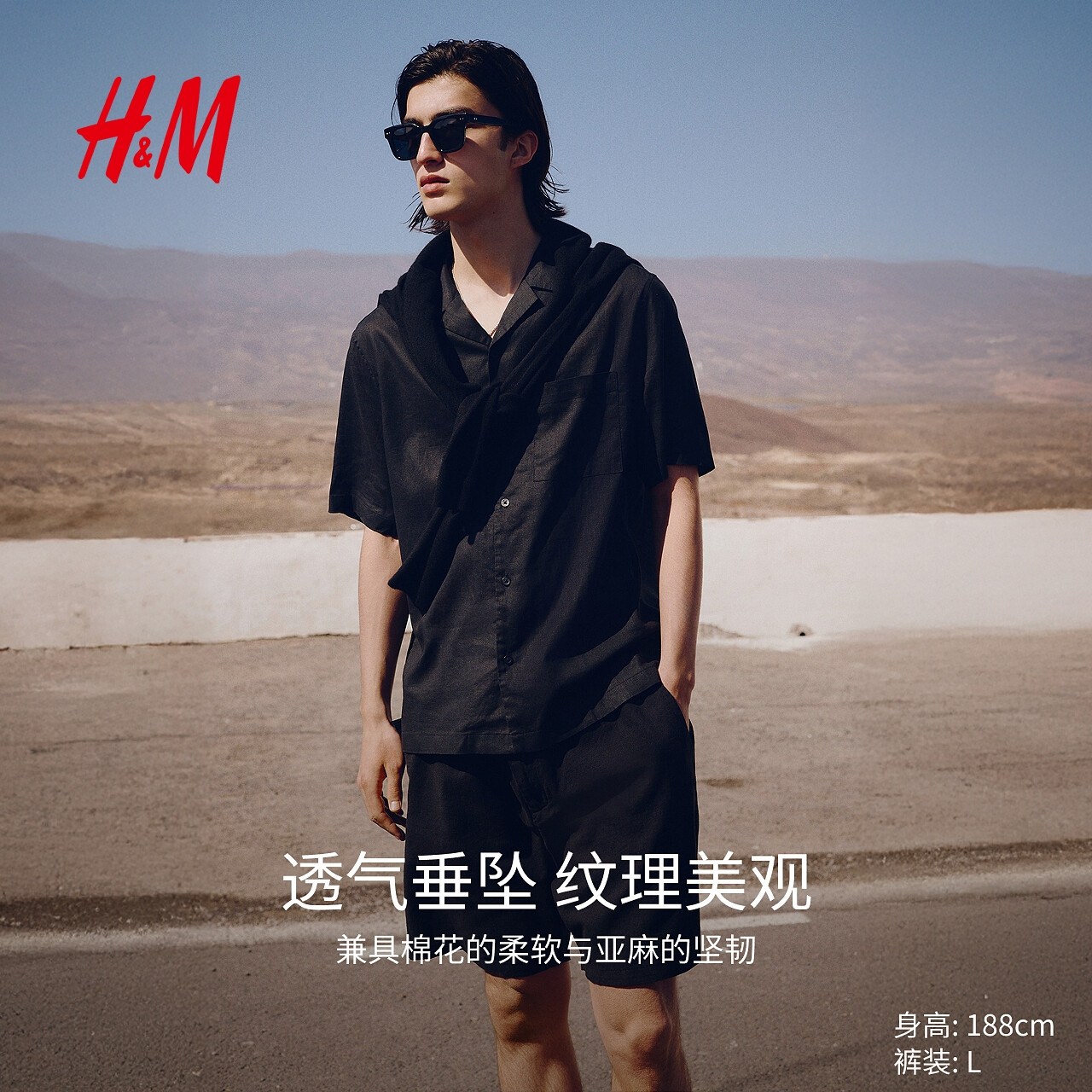 HM男装古巴领衬衫2025冬季新款潮流宽松亚麻混纺短袖衬衣1256946