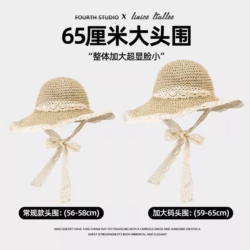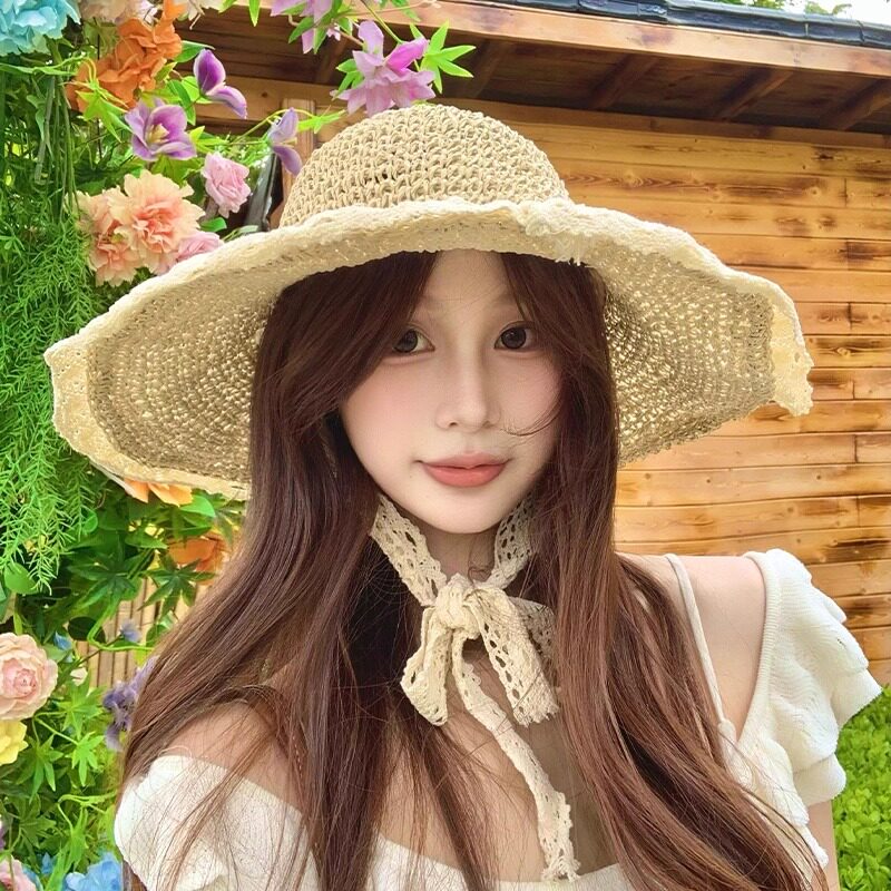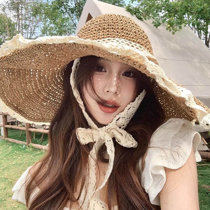 草帽女夏海边2025沙滩加宽加大帽檐蕾丝系带镂空新款防晒遮阳帽子