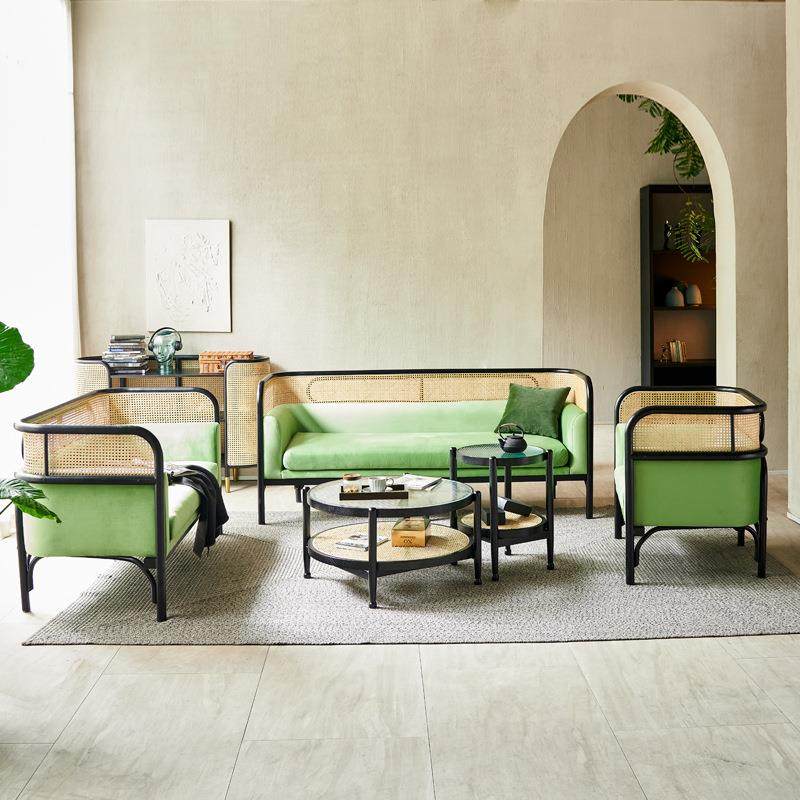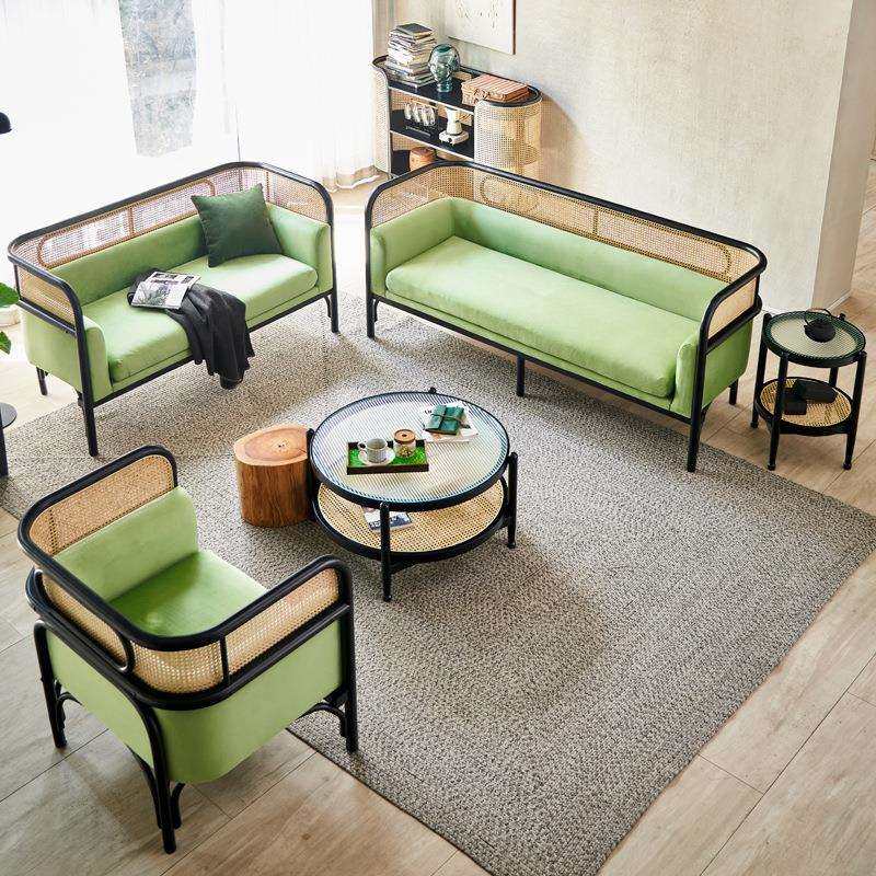 北欧布艺实木沙发现代简约客厅三人位沙发民宿酒店藤编沙发真藤