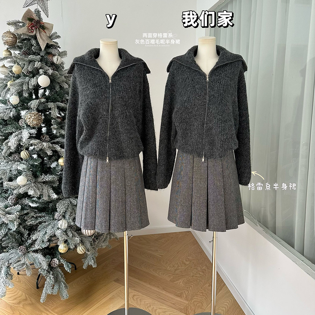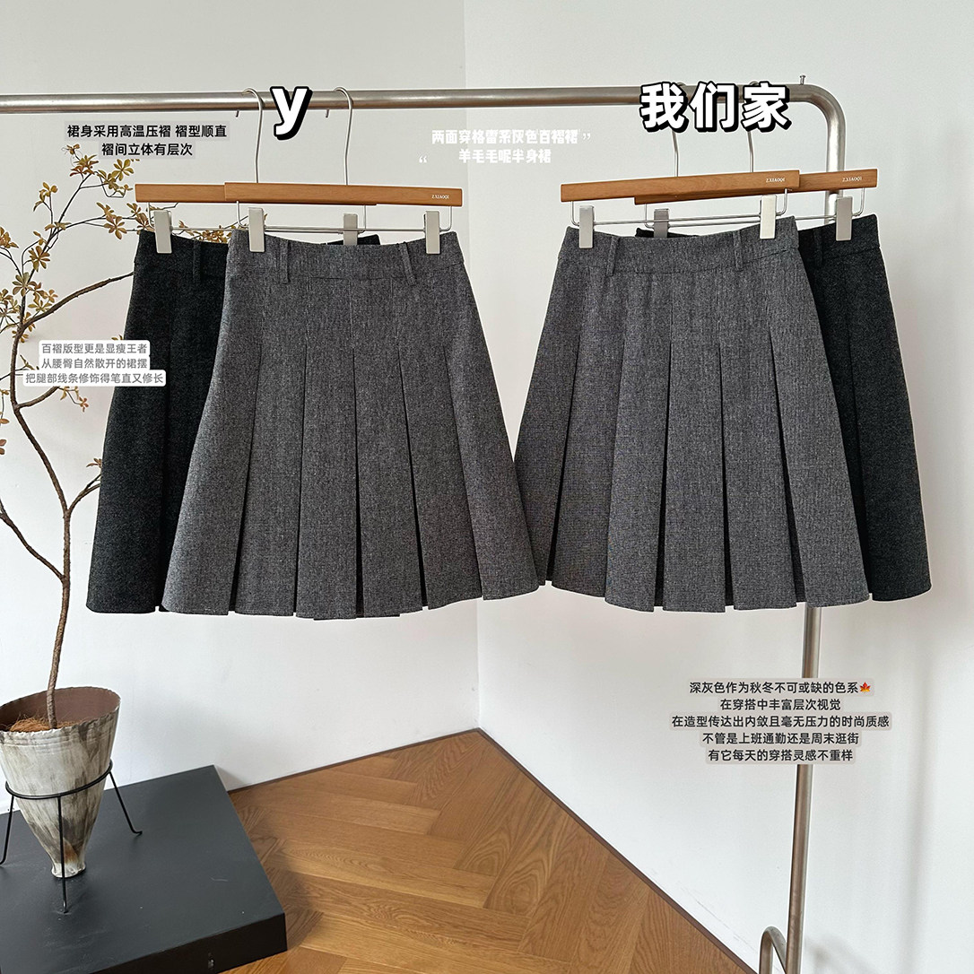 柒月末 两面穿格雷系灰色百褶裙中裙知识分子秋冬羊毛毛呢半身裙