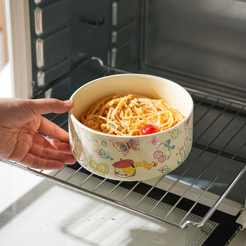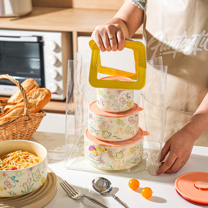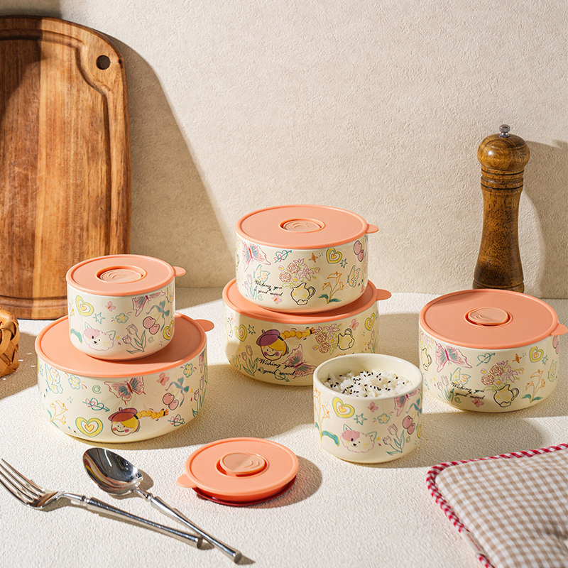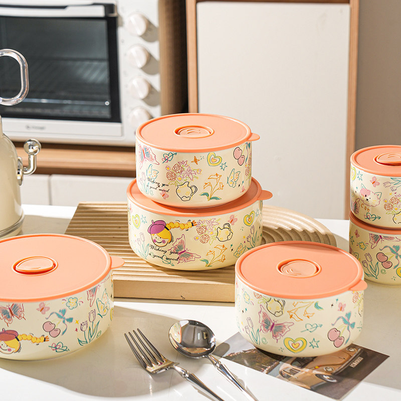 舍里卡通保鲜碗密封带盖便携陶瓷饭盒上班族微波炉加热便当盒餐盒