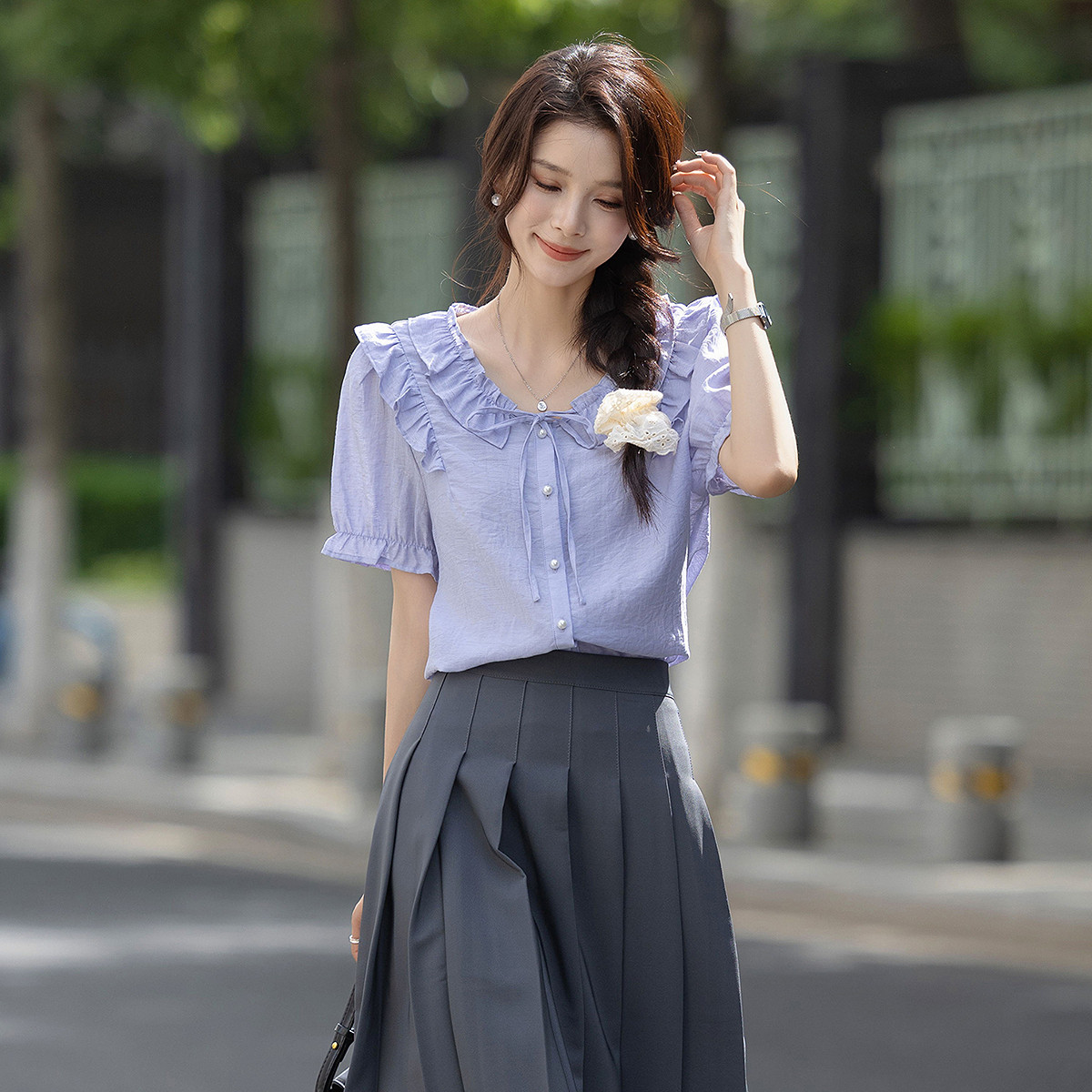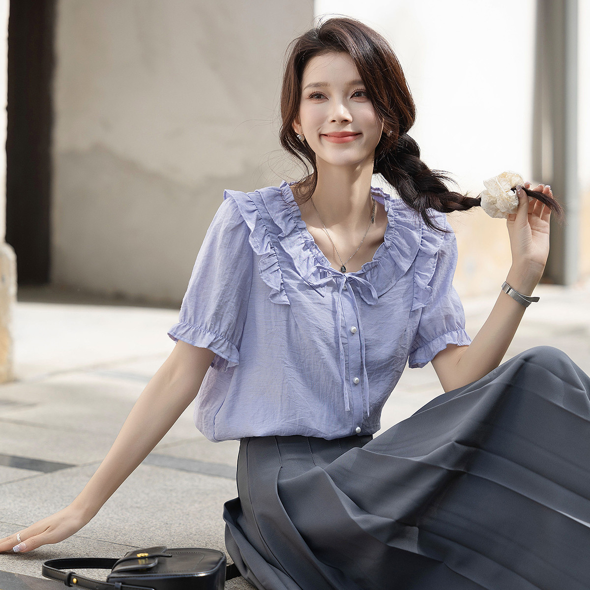 唐狮春夏季衬衫女装新款法式温柔风泡泡袖紫色系带设计感显瘦上衣