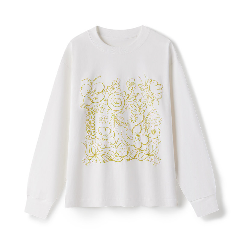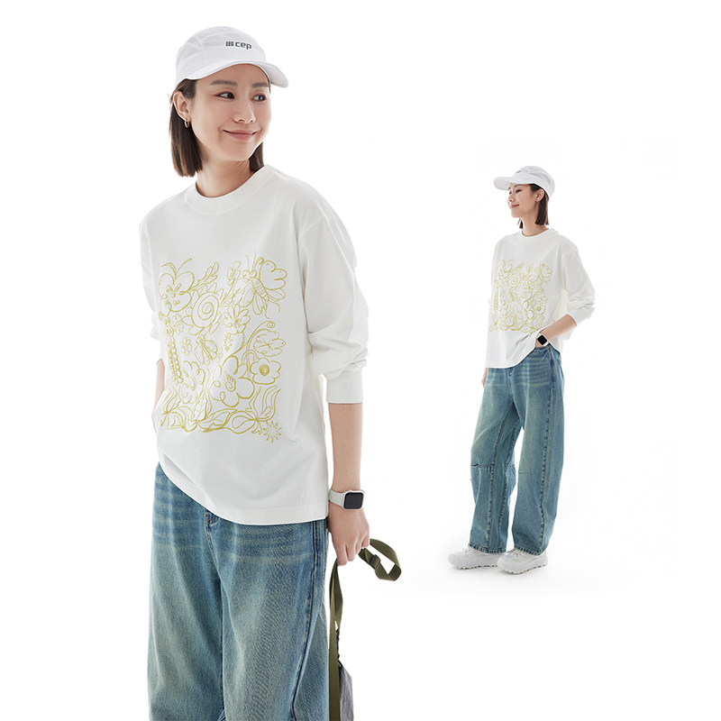 云上生活【春日T】简约发泡印花圆领宽松落肩长袖女T恤春装上衣