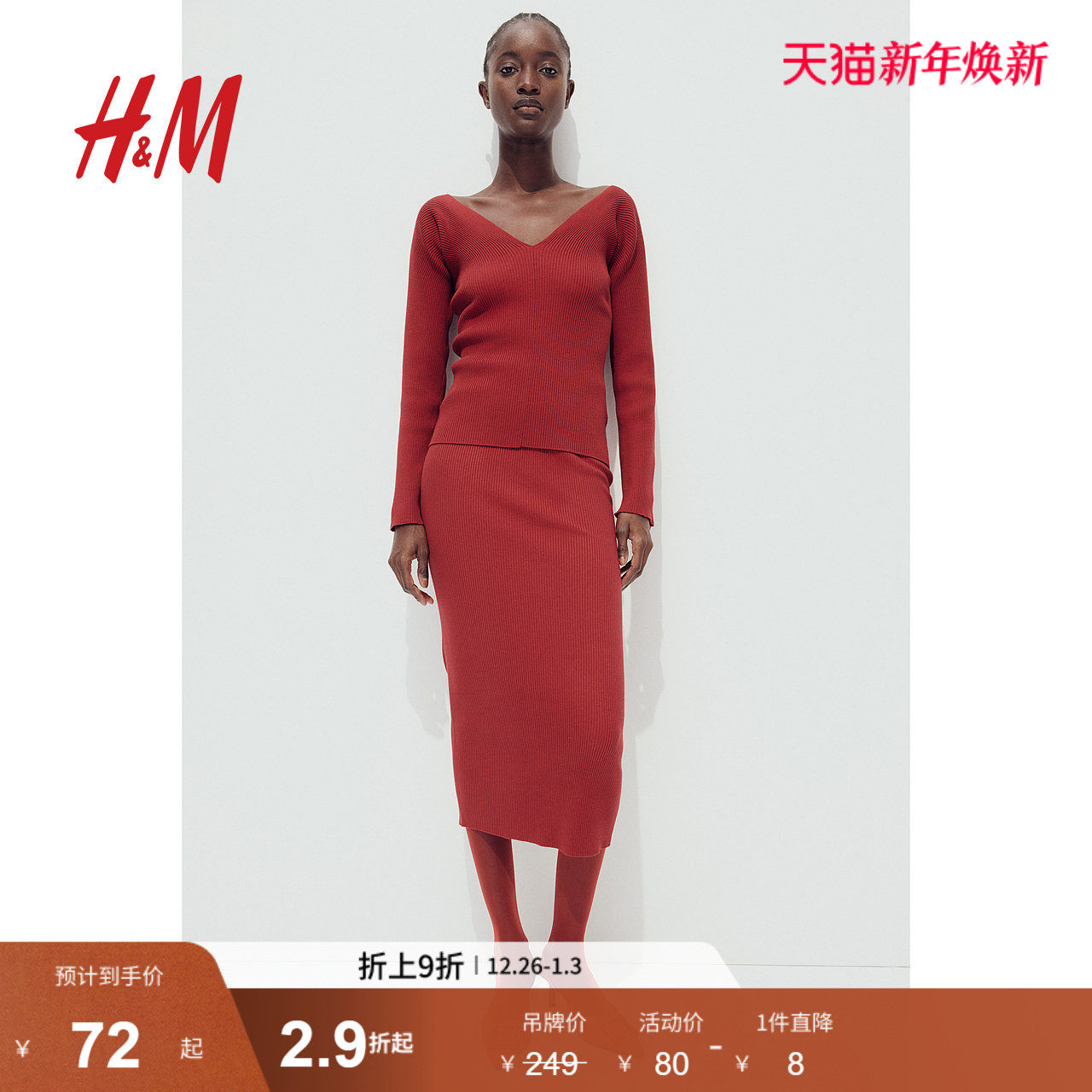 HM女装红色半身裙冬季新年铅笔裙罗纹针织礼服修身半身裙1261055