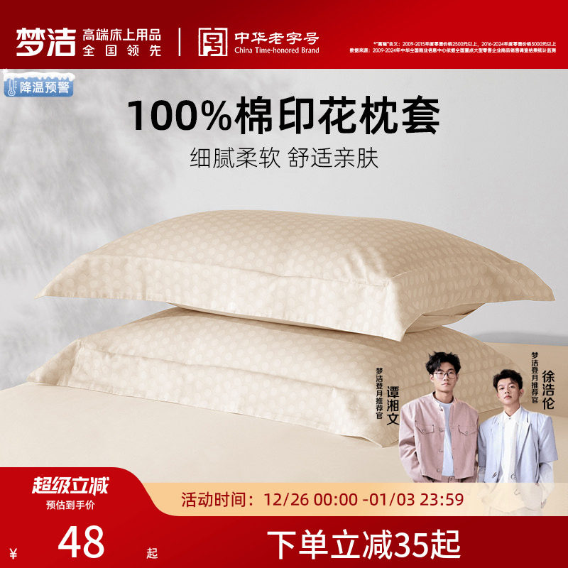 梦洁家纺枕套2025新款纯棉全棉夏季宿舍枕头套100全棉一对装散件