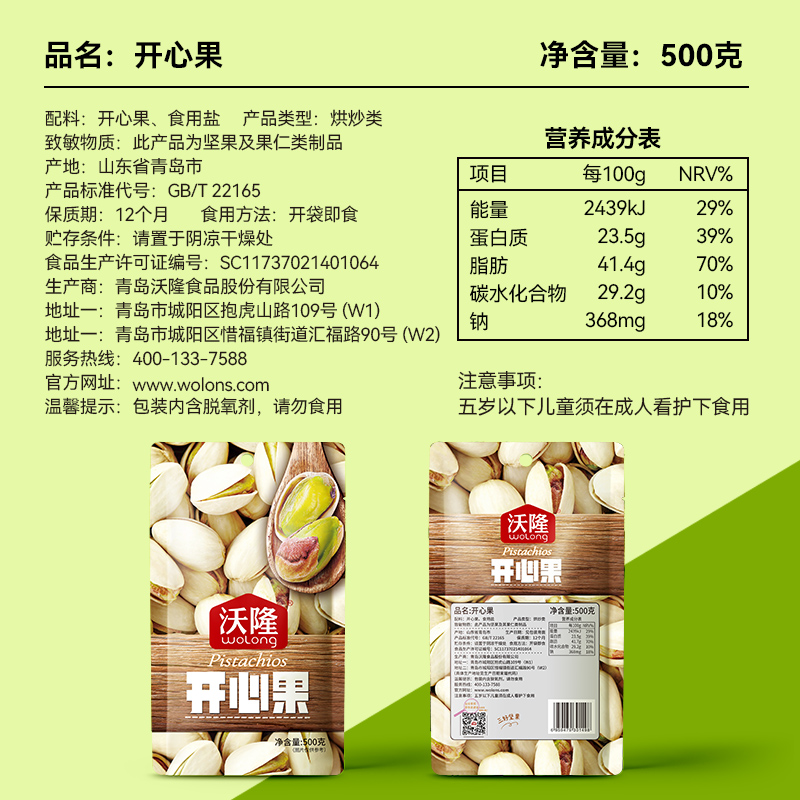 【烈儿宝贝直播间】沃隆开心果500g原味无漂白坚果零食炒货新货