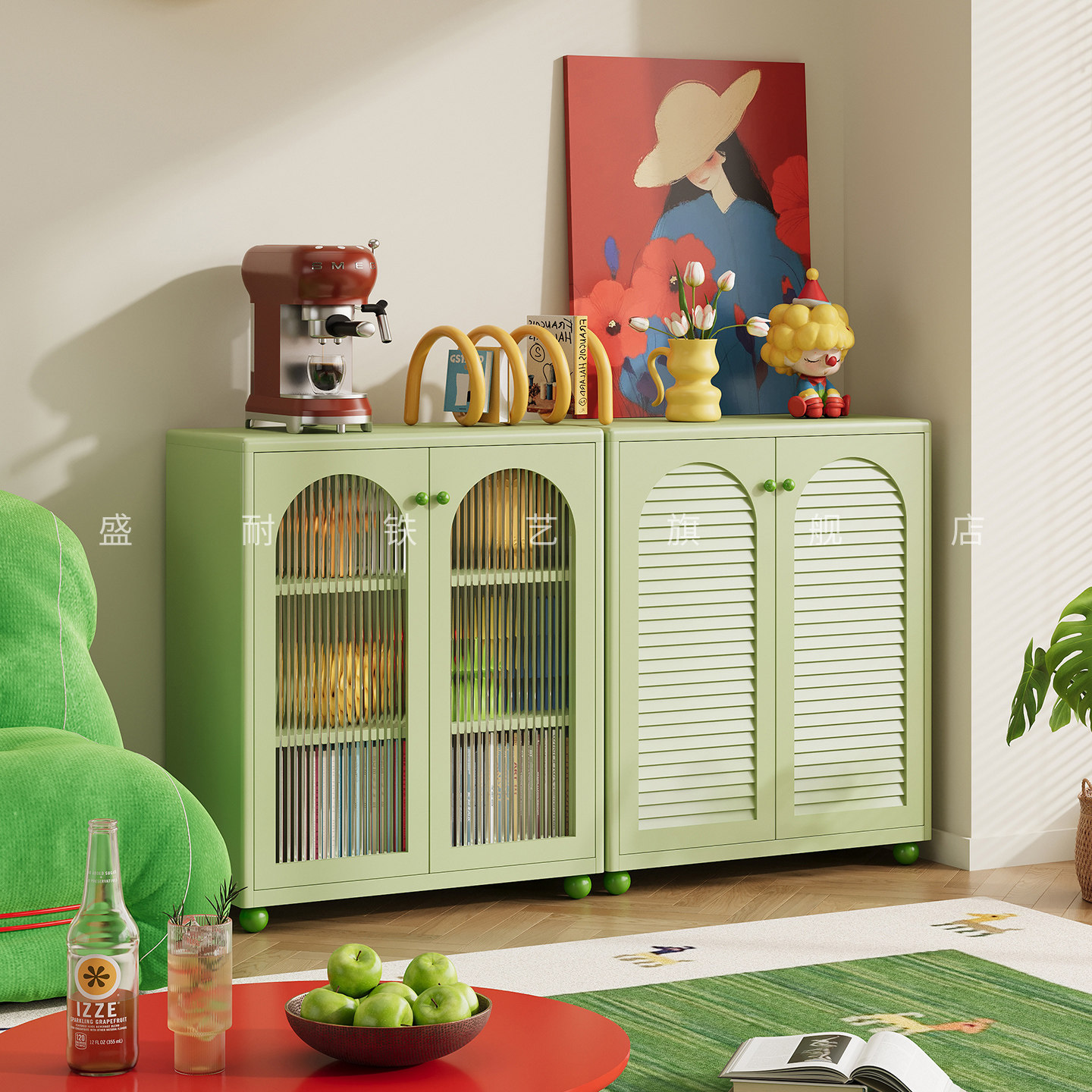 绿色中古风钢制书柜学生家用开放式落地多功能书架展示柜储物柜子
