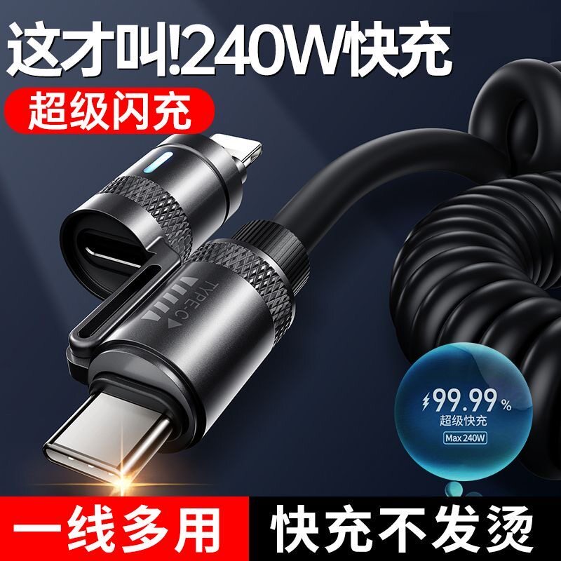 适用香薰240w四合一弹簧线车载快充线锌合金TypeC变换接口数据线