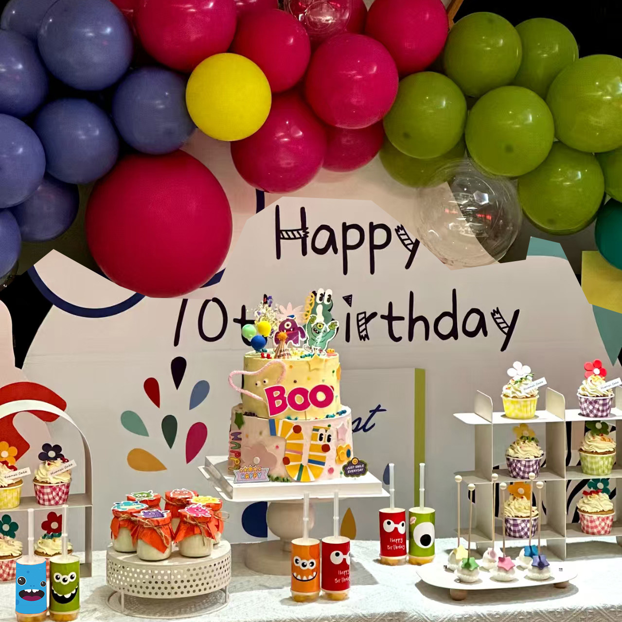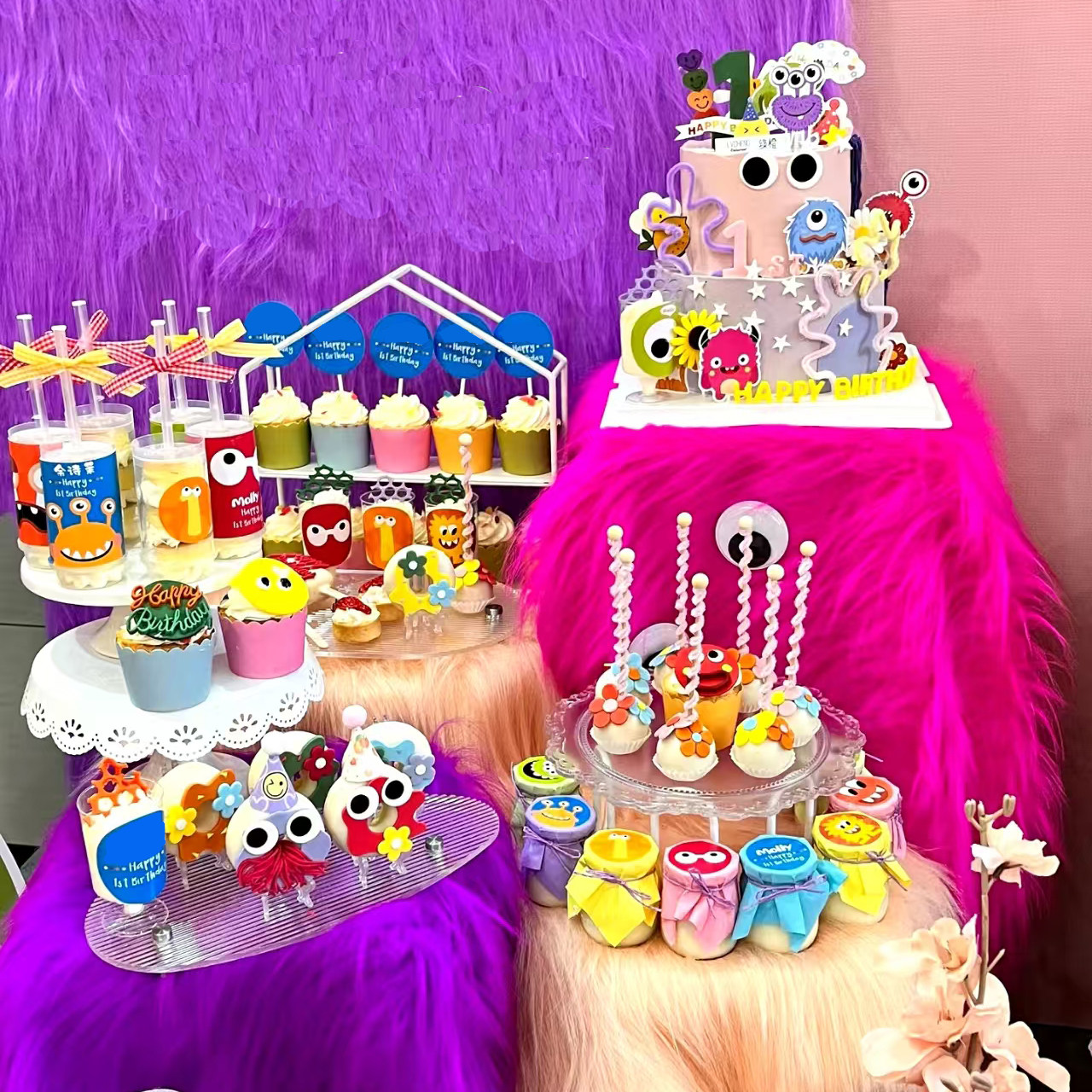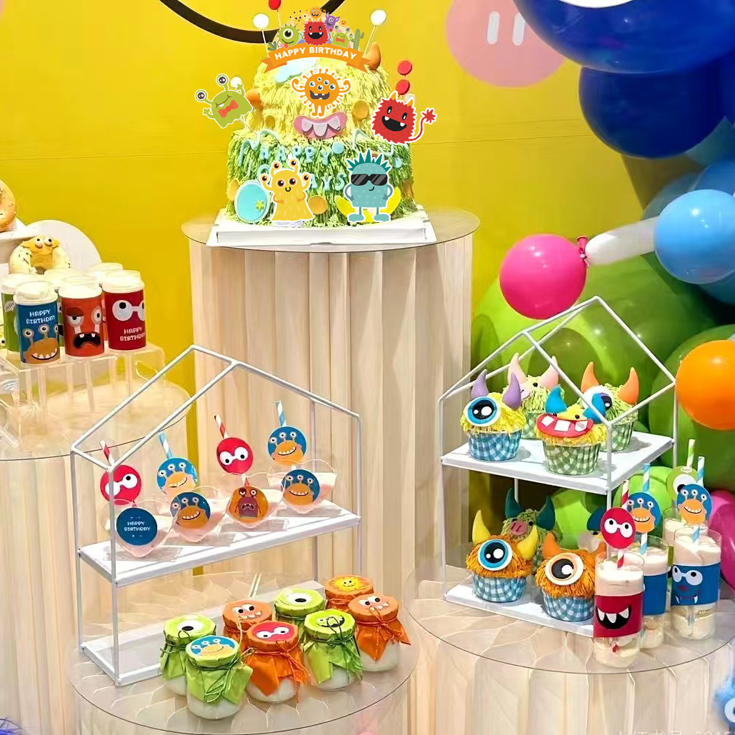 多巴胺甜品台装饰小怪兽蛋糕儿童生日帽子纸杯插件彩色布丁杯贴纸
