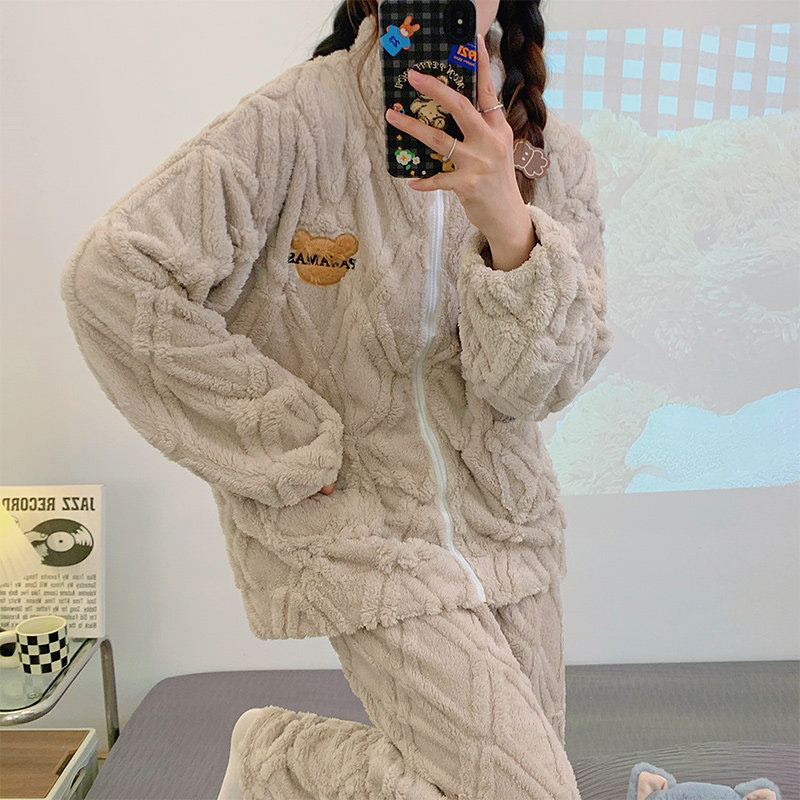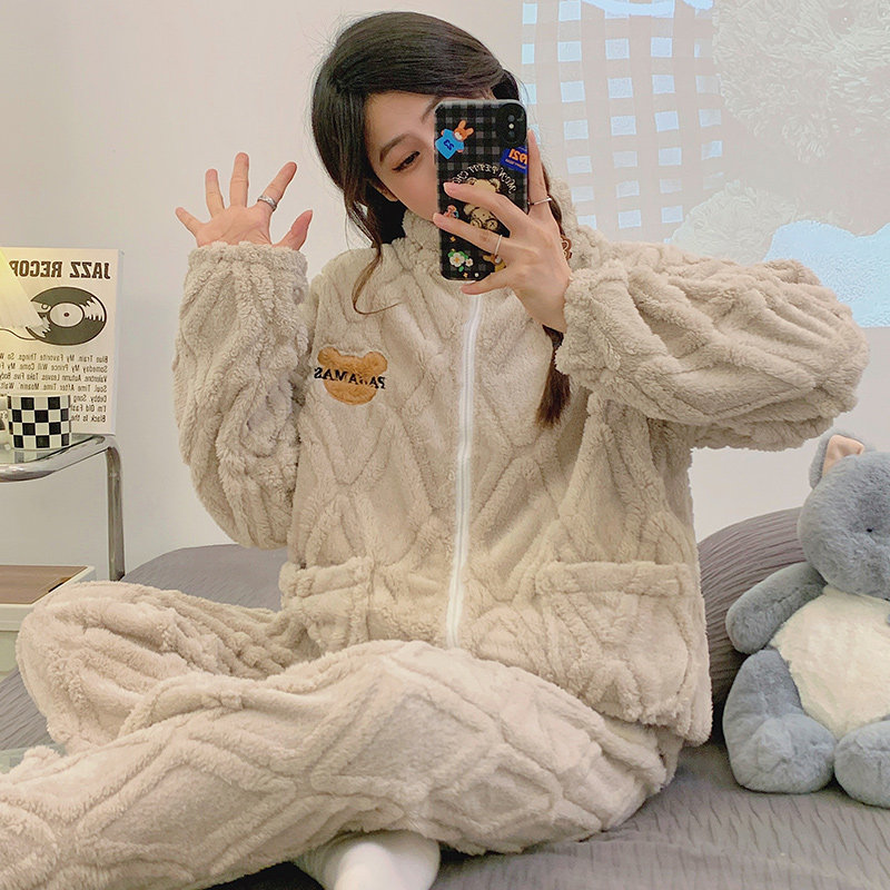 高领拉链珊瑚绒睡衣女冬季宽松加绒款法兰绒可外穿家居服套装外出